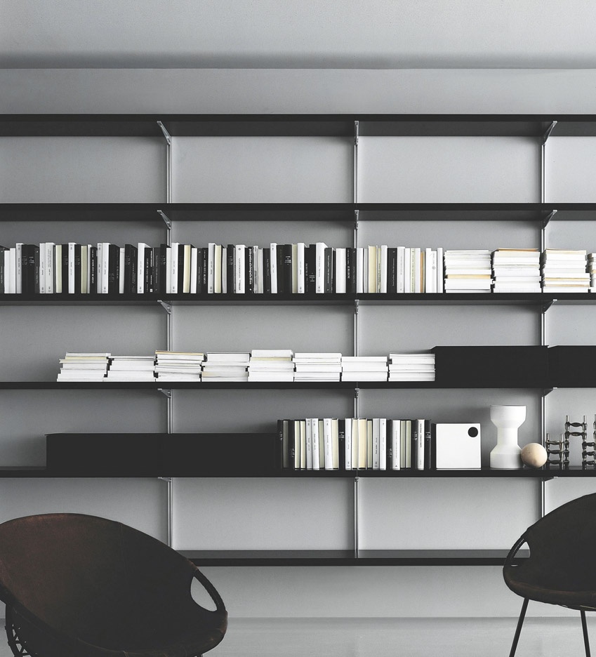 Rack Ed from Italian manufacturer Porro. Hinged bookcase, the bookcase system is made of anodized aluminum. Frame and shelves made from exotic wood mongoi, oak or black finishes in Matt or glossy lacquer from the collection company. Fittings and retention mechanisms of die-cast aluminum.