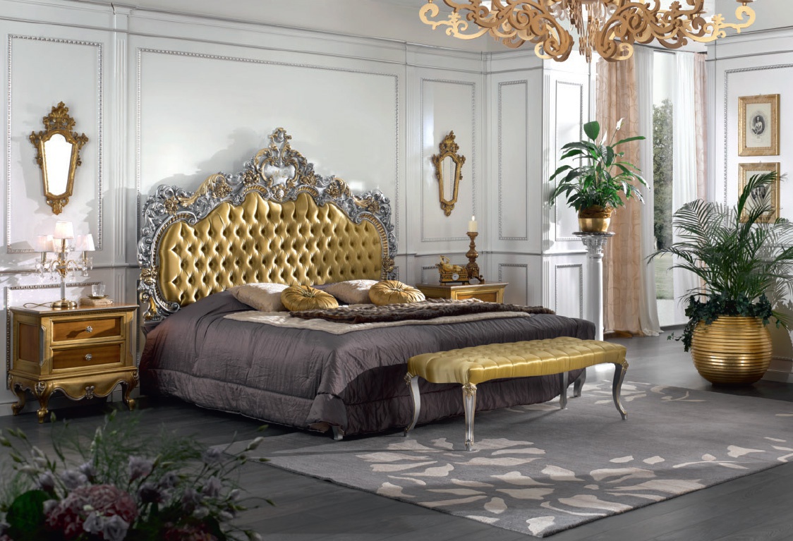 Bedroom (Suite bedroom) from the Italian manufacturer Mirandola Export. Set includes: double bed and bench. The furniture is made of wood. Decoration is carved and gilded elements. The upholstery is made of textile cloth.