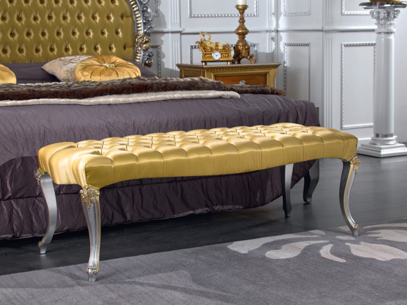 | Description: | Bedside bench from the Italian manufacturer Mirandola Export. Seat in soft quilted upholstery. The frame is made of wood and decorated with carved and gilded elements. Finish - M77. The upholstery is made of textile fabric - MG213 Gold. The color in the photo. |