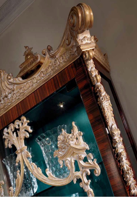 Showcase from Italian manufacturer Zanaboni executed in classical style. Is a structure consisting of a wooden frame, glazed shutters, shelves made of glass. Decorations are carving, inlay, gilding, made by hand. The perfect choice for a living room, dining room.