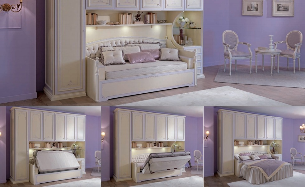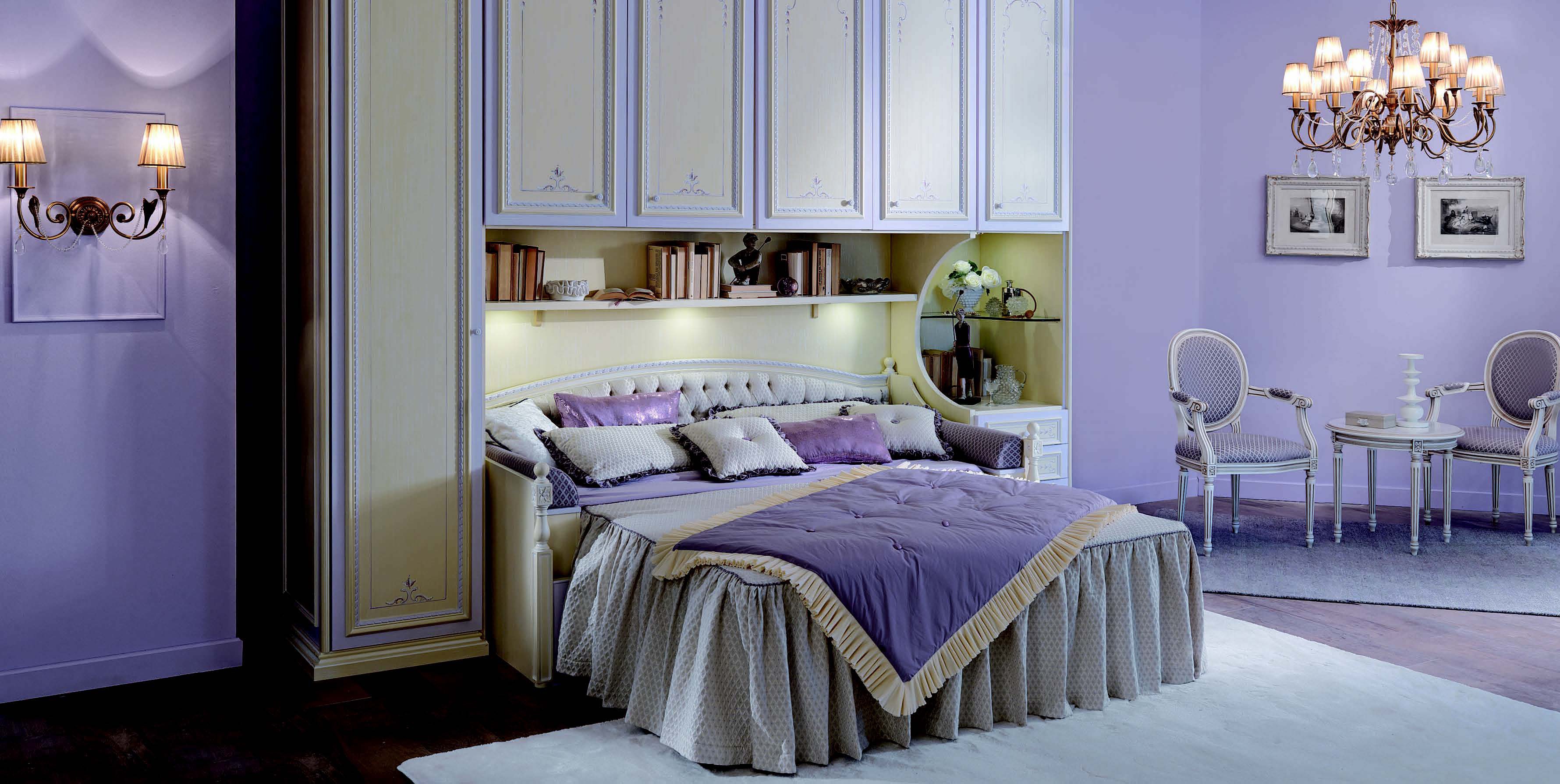 Sofa bed Irma from the Italian manufacturer Pellegatta. Structure made of multilayer wood and solid. Finishing varnish from the range of the company, hand painted. Upholstery textile - the directory of the manufacturer. Product in a classic style, perfect choice for bedroom, nursery and teen rooms.