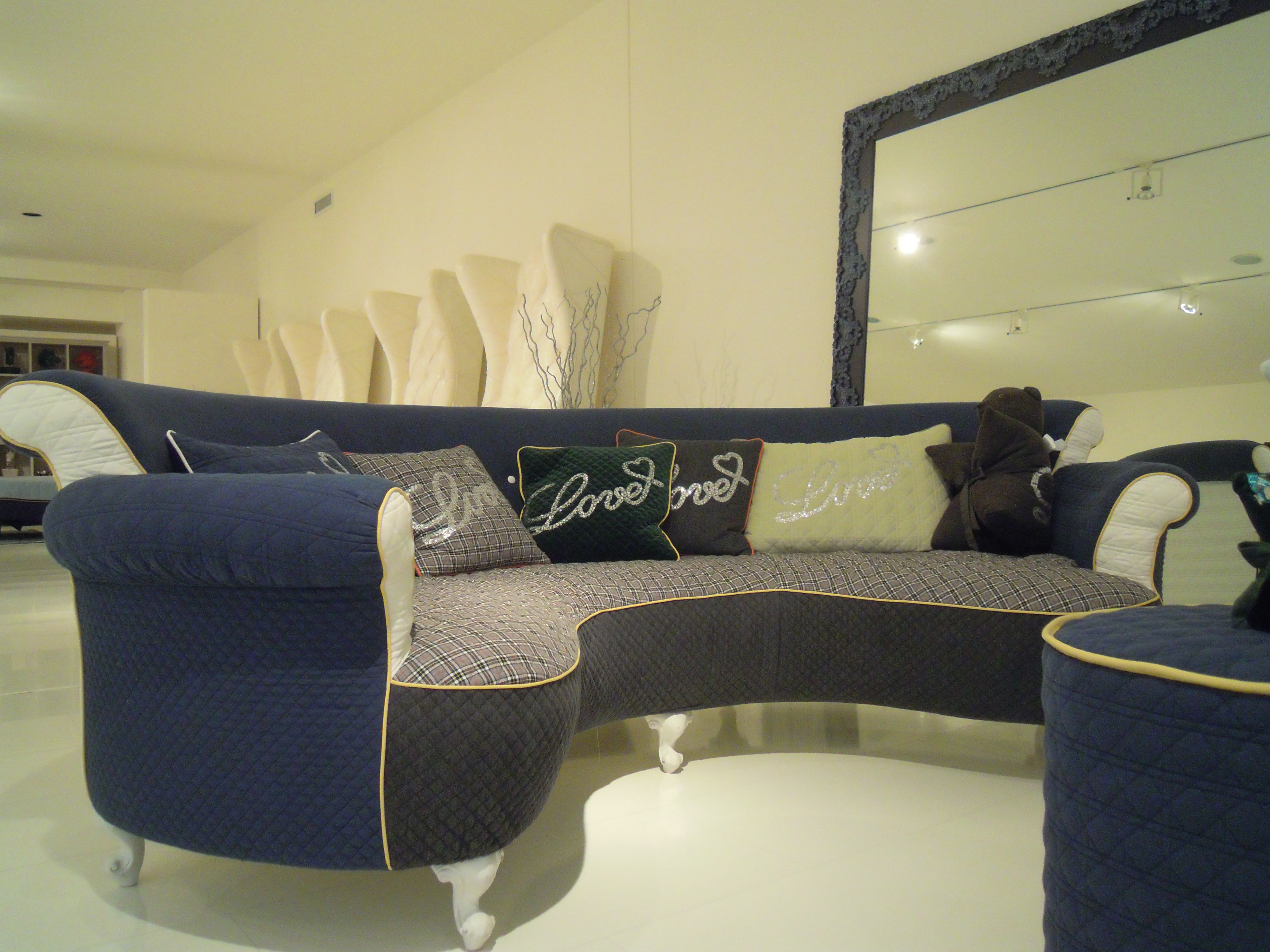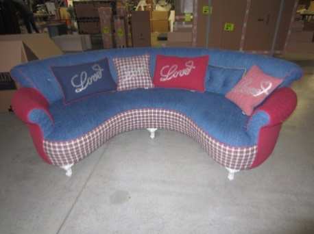 The semicircular sofa in blue and red upholstery textile Fagiolo, Halley