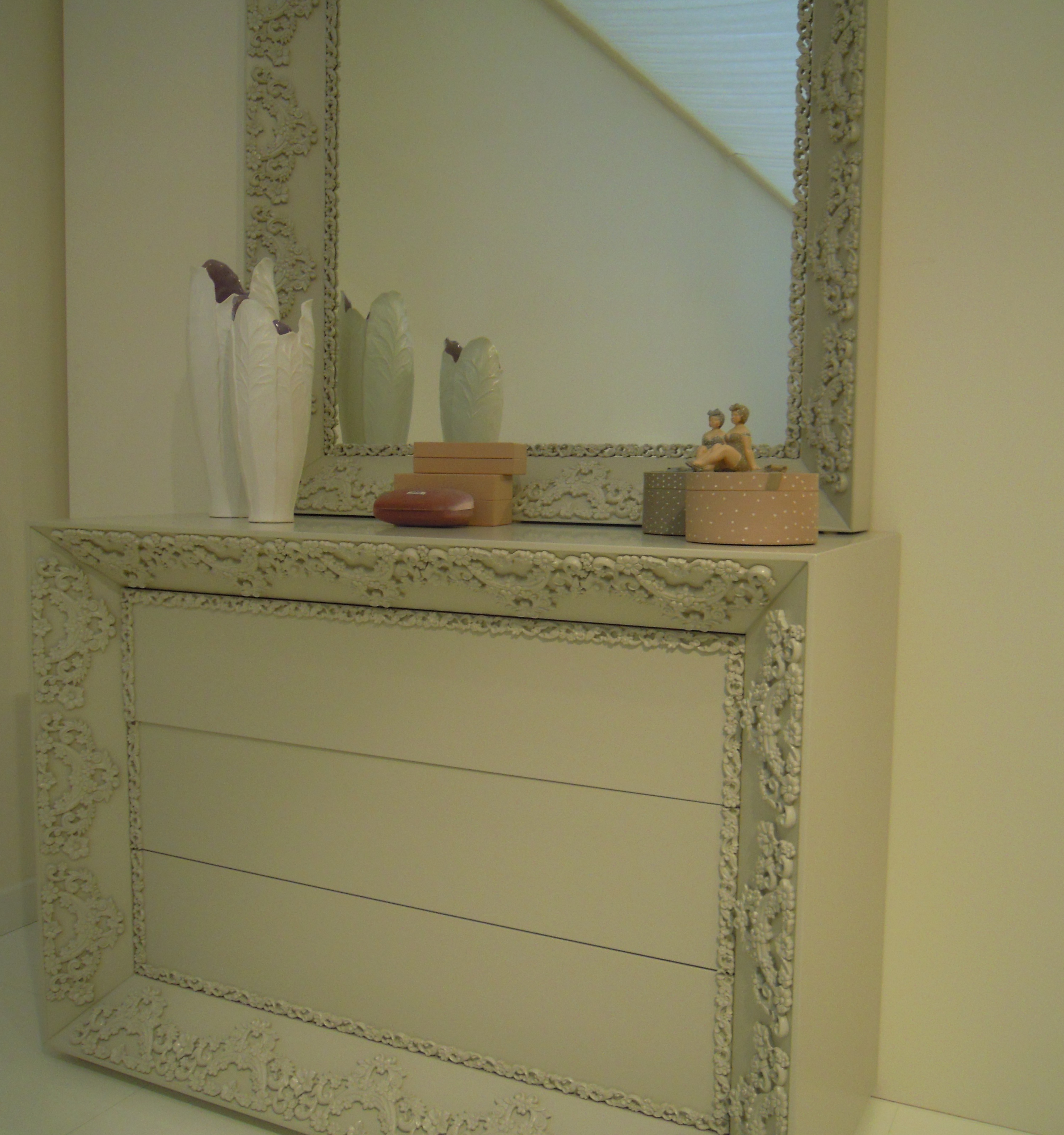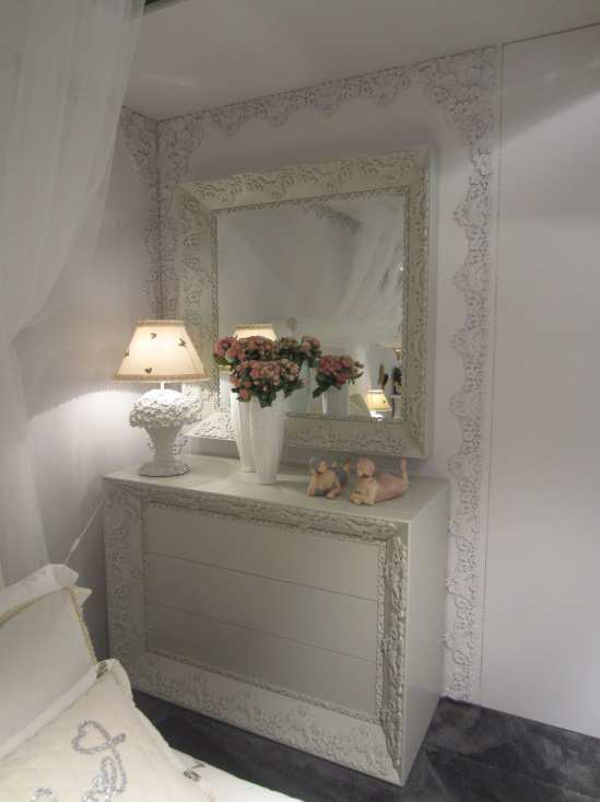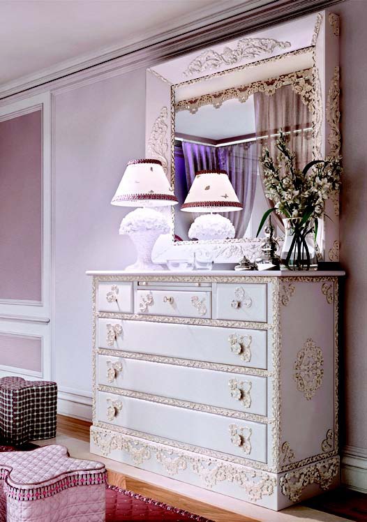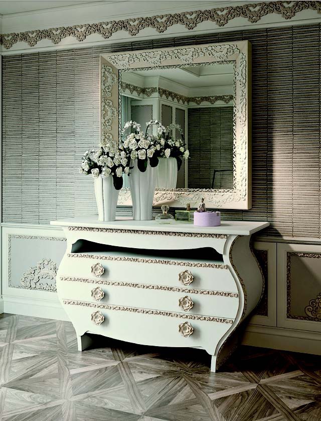The mirror is 45 ° from the Italian manufacturer Halley. Square frame made from solid wood. The surface is covered with varnish from the range. The decor is a convex floral ornament, making the product simple forms of acquired elements of Neoclassicism. The perfect choice for interior decoration. The dresser from the same collection will be a great addition.