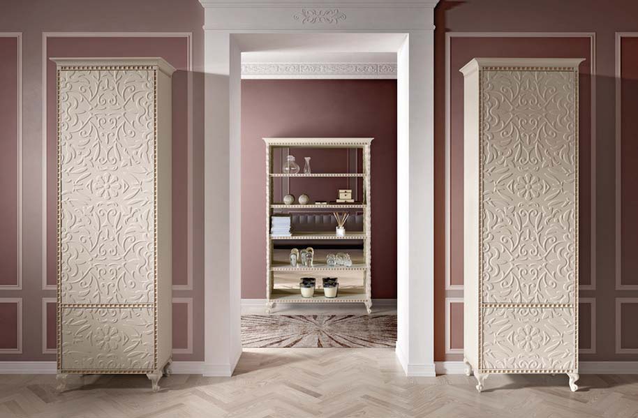 The rack is from the Italian manufacturer Halley. The frame is made of solid wood. The rear wall of bronze glass. Carving of oak. Product with embossed sidewalls. The decor speaks thread, floral ornament. Colors - in stock. The art Deco style, a perfect choice for interior decoration that will give it elegance and solemnity.