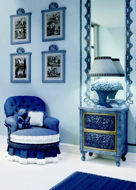 | Description: | The Sally chair from the Italian manufacturer Halley. Frame, legs made from solid wood. Back CAPITONNE', a wide rim seat and skirt in cat.D 74811, back in cat. H 78811, armrests and seat in cat. G 77811 17 SWAROVSKY, with tape art.COLOVE03 and fringe art. SPLOVE03 with white lace. Color range: blue. The finish on the main picture. |