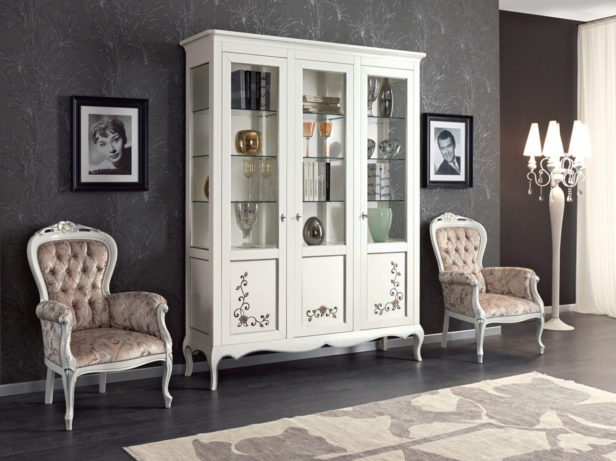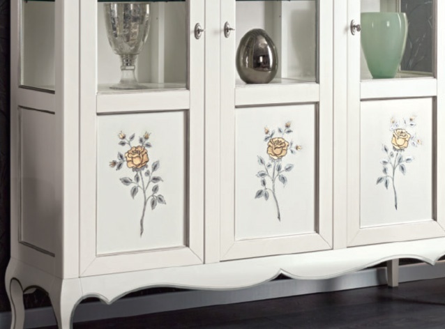 Showcase from Italian manufacturer Mirandola Export. Three door model with double doors. The frame is made of wood and decorated with floral decoration. Finish - M62+M27. The color in the photo. The design is executed in classical style.
