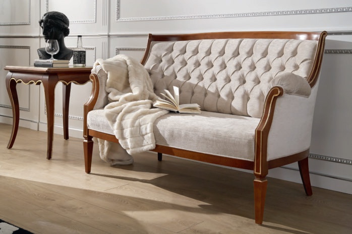 | Description: | Sofa from Italian manufacturer Mirandola Export. The frame is made of wood. Finish: M1+M25 antiqued. The back of the sofa decorated with a decorative stitch. The upholstery is made of textile fabric: MG236. The color in the photo. |