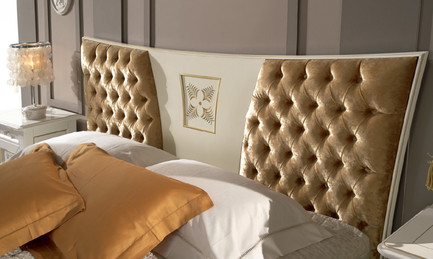 Bedroom (Suite bedroom) from the Italian manufacturer Mirandola Export. Set includes: double bed, bedside tables, bench, wardrobe, chest of drawers, dressing table, stool and mirror. The furniture is made of wood, carved and gilded elements. The upholstery is made of textile fabric and leather. The design is executed in classical style.