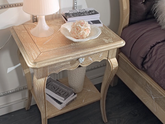 | Description: | Bedside table from the Italian manufacturer Mirandola Export. Model with small drawers and shelf. The frame is made of wood. Finish: Parchment & Gold hollow effect “Golden Spring Theme”. |