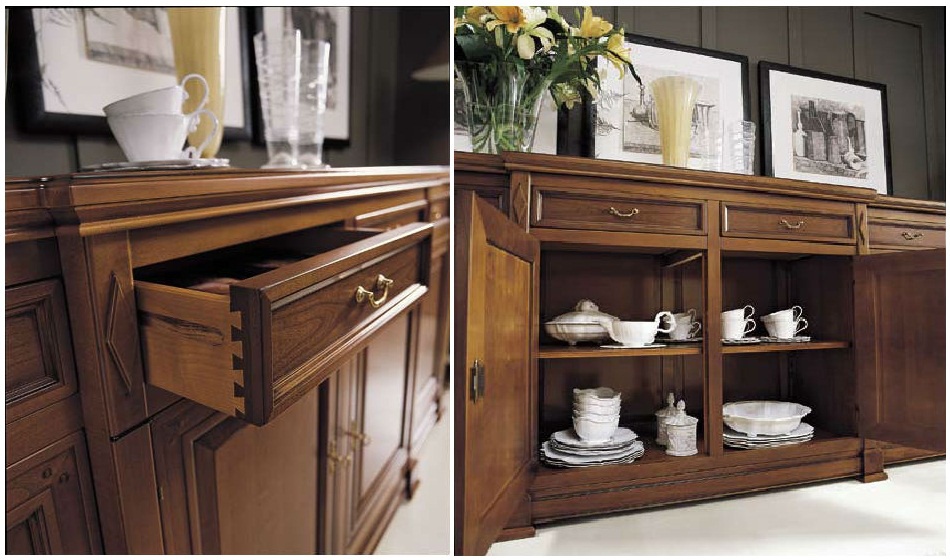 The buffet Athene from the Italian manufacturer Serenissima. A snack bar, three fitted drawers, decorated with metal fittings. The frame is made from solid wood, in cherry finish, coated with clear lacquer. Connections are made by means of fastening "swallow tail", forming a sturdy construction. Product in a classic design, you'll be straight concise lines. Included in the dining set collections Athene.
