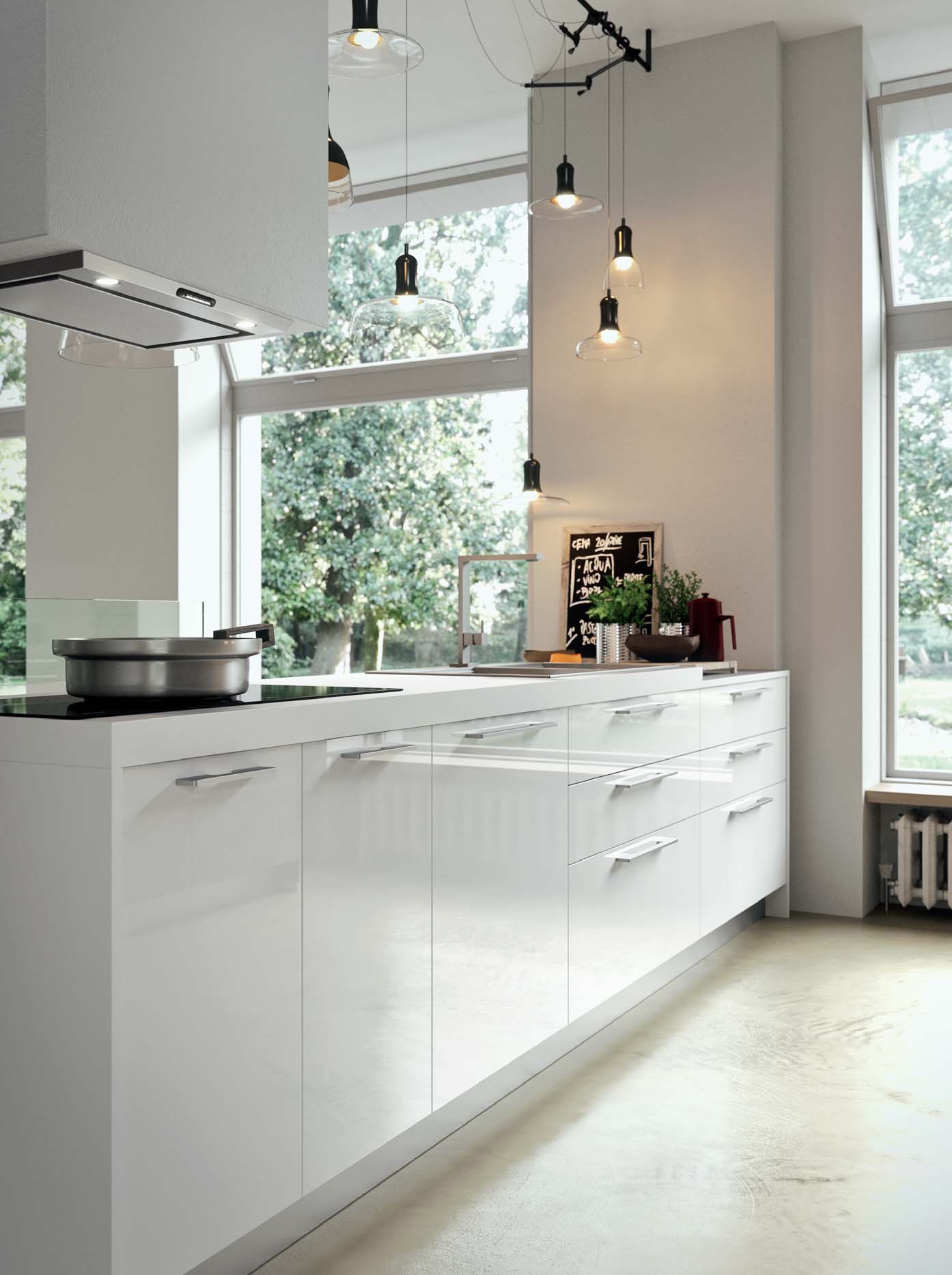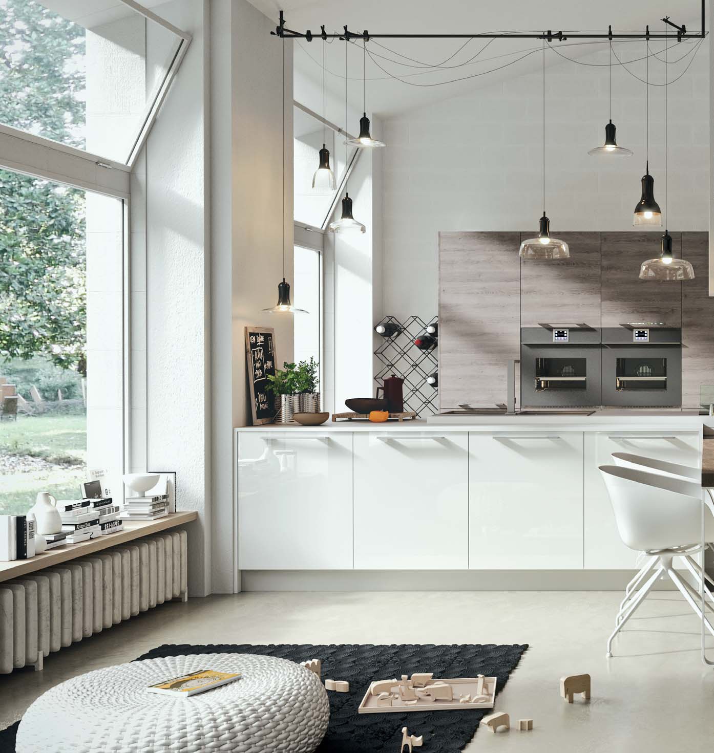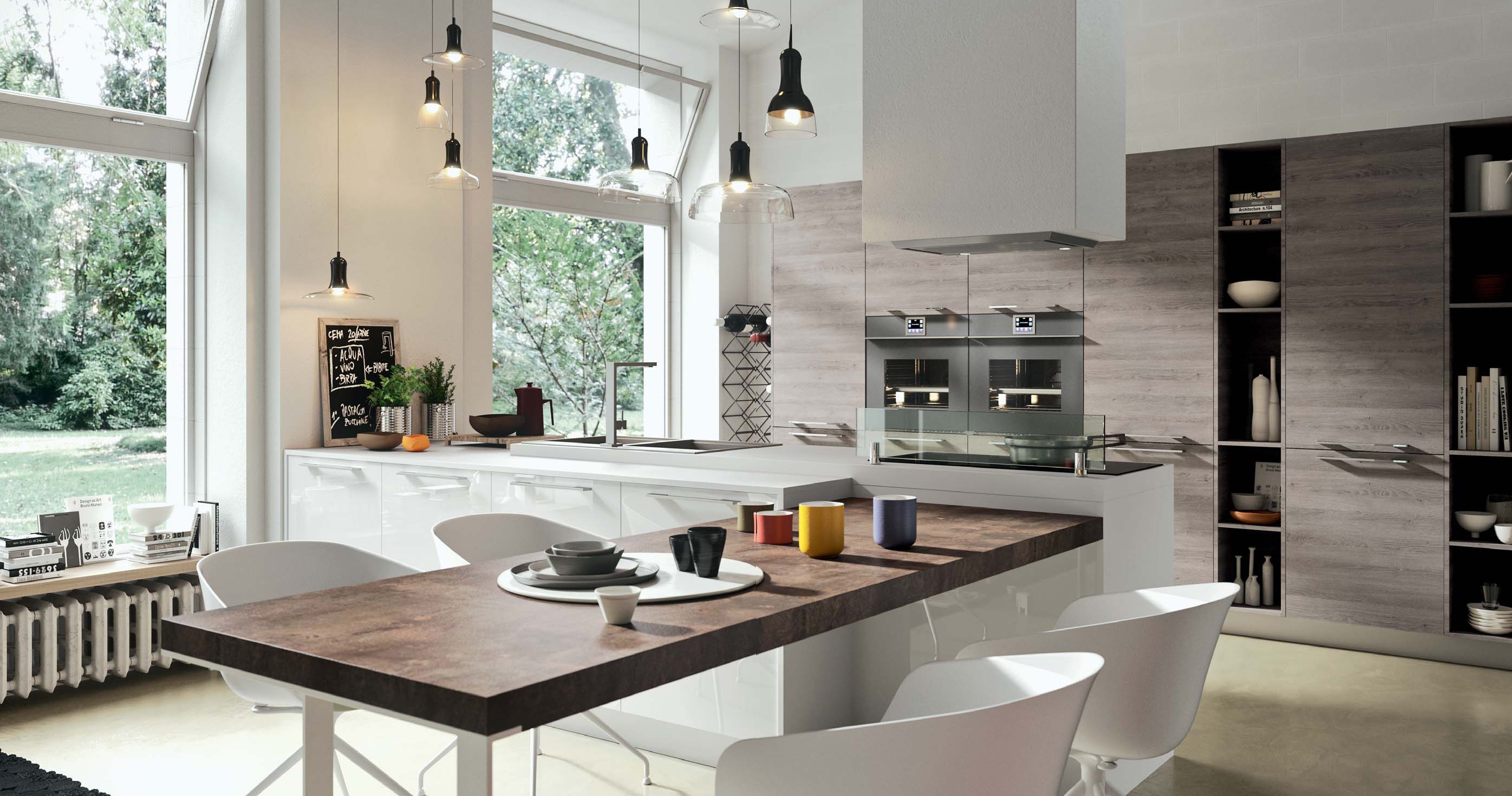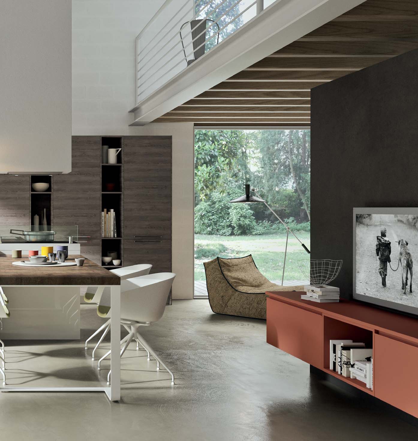 Kitchen Bahia comp.4 from the Italian manufacturer Ar-Tre. The headset frame is made of waterproof wood. Facades finishing oak veneer and high gloss lacquer finish, combined white and red, metal handle. The counter tops of different heights made of artificial stone. Built-in appliances. Colors to choose from manufacturer's catalogue. Kitchen designed in modern style. A dining table and TV area.