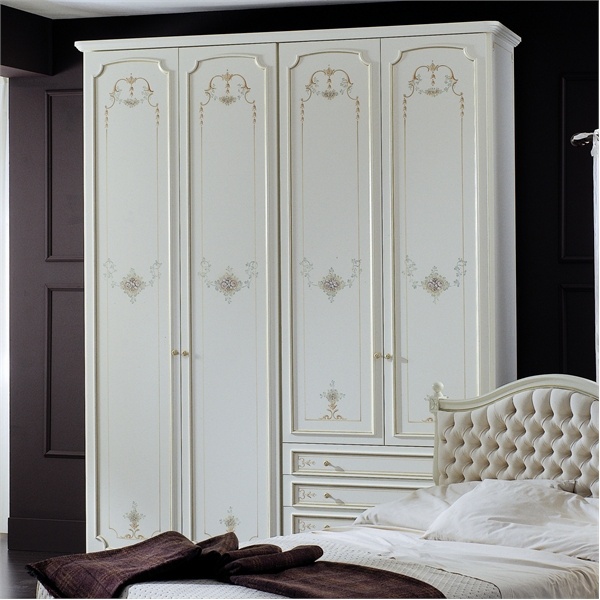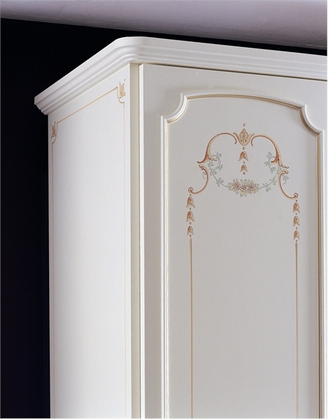 Perla wardrobe Armadio from the Italian manufacturer Pellegatta. The number of sections and the composition on customer request. Have drawers and sections with hinged doors. The frame is made of plate with cell vypolneniem on the basis of solid spruce. This material is called tamborito. The basement and the fronts of the drawers are made of solid wood, ramino. Finishing is done manually, perhaps staining in any color options from the range or by a given sample. The model is decorated with hand painting technique of tempera miniatures; used 6-8 colors, drawing from the catalog of the factory or on the customer's sketch. It is proposed to be set for a child's room, adding a closet bed, bedside Cabinet, dressing table with mirror and stool.