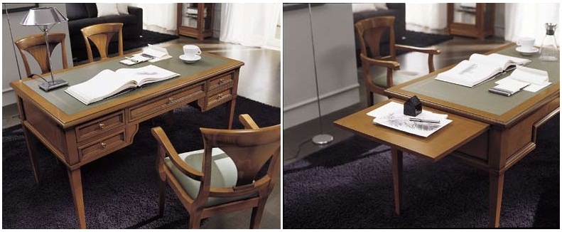 Desk Athene from the Italian manufacturer Serenissima. The product is made from solid wood. Top tabletops are covered with leather. The surface of the frame treated with lacquer. The product is equipped with a retractable table tops at the sides, decorated with metal fittings. The table in classic style, part of a Desk set collection Athene.