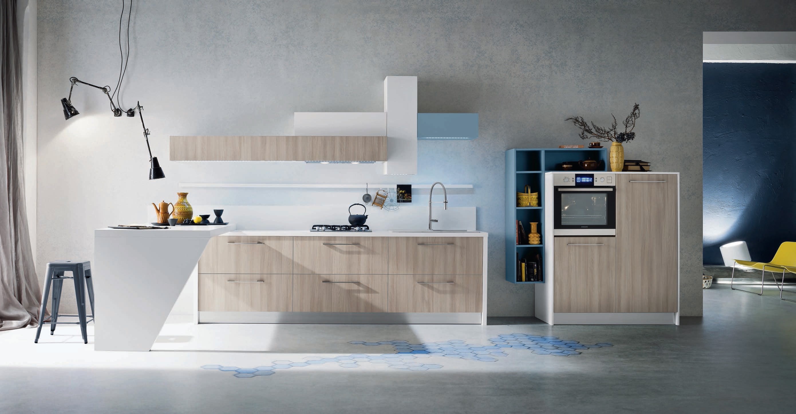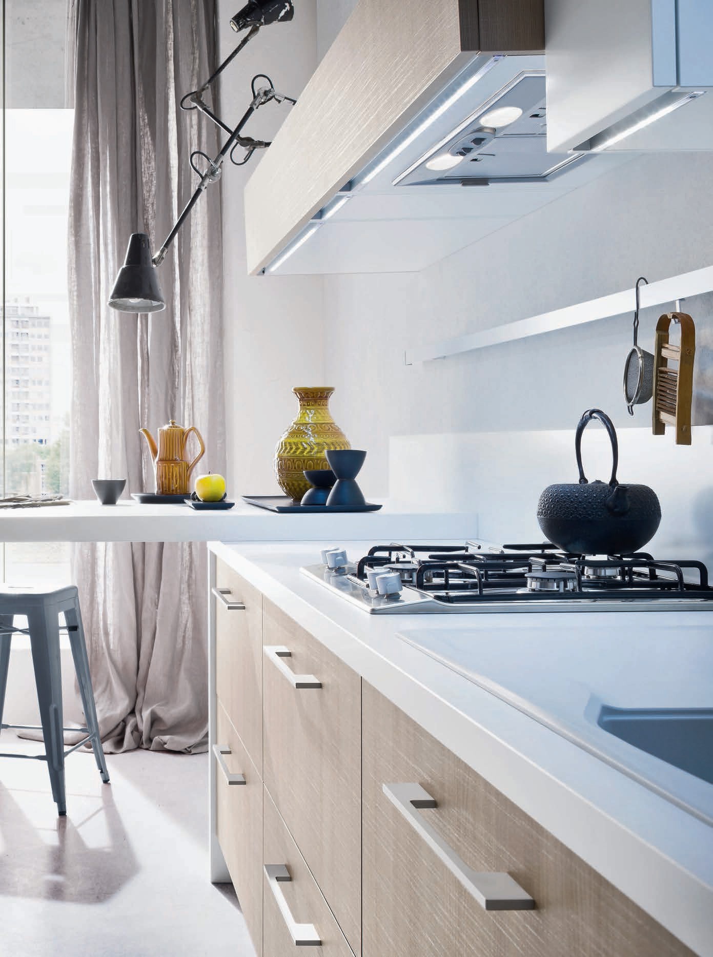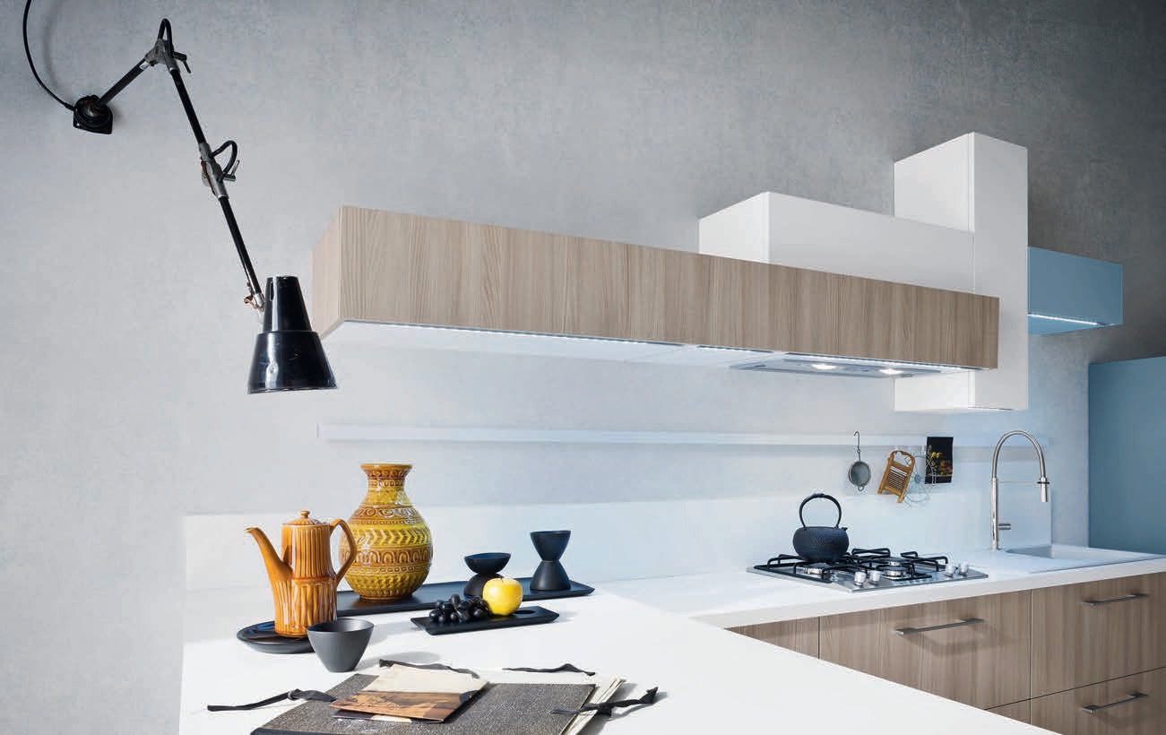 Set for kitchen Idea comp.1 from the Italian manufacturer Ar-Tre. The model is made in modern style. Includes the bar, with low columns and a system of mounted cabinets of various shapes and sizes. The material of the frame is water-repellent wood, fronts in veneer finish and Matt lacquer. Finish option to be selected from a catalog company. Built in illumination.