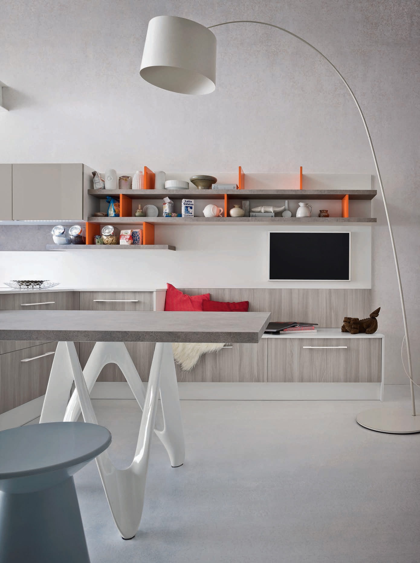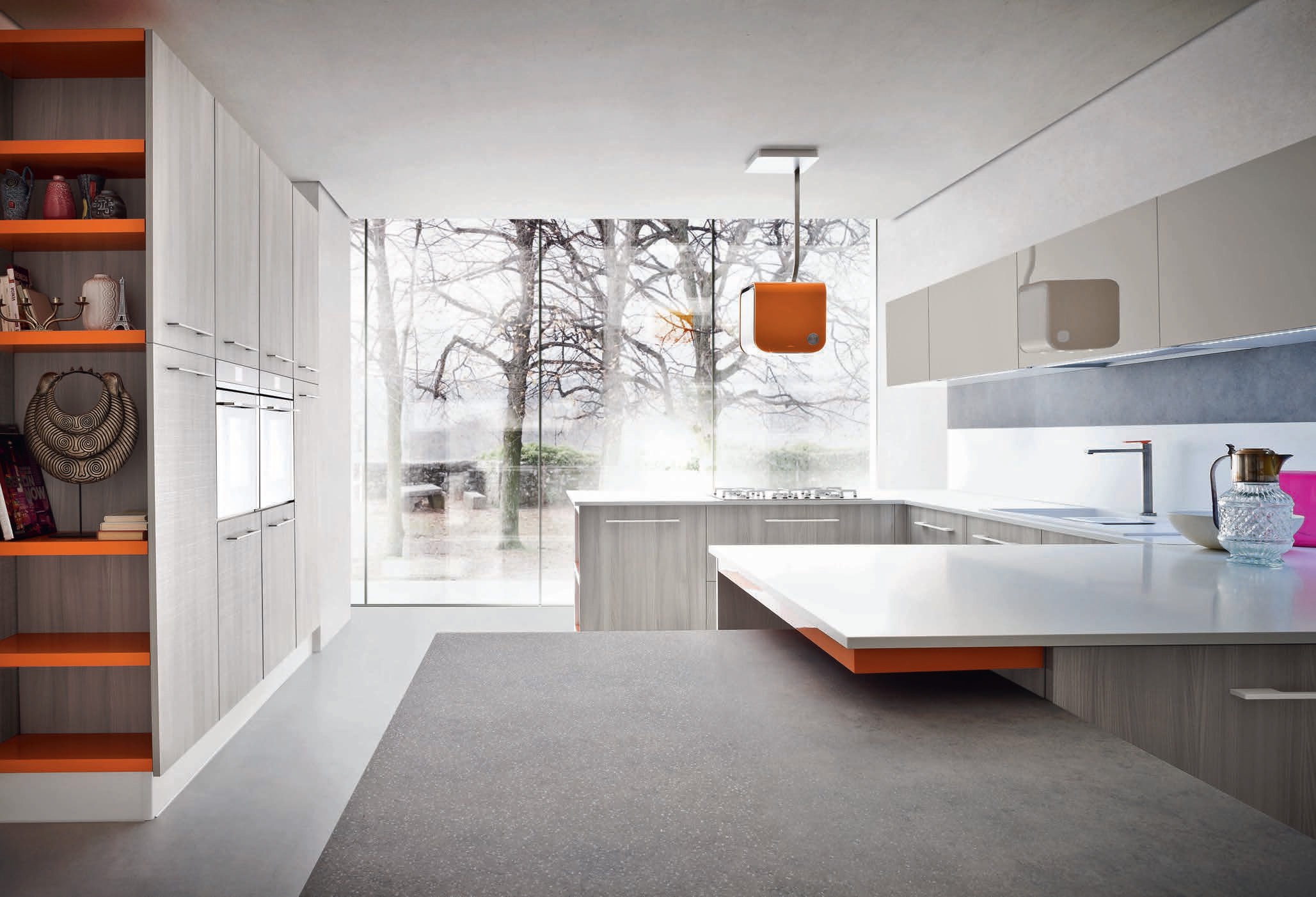 Set for kitchen Idea comp.2 from the Italian manufacturer Ar-Tre. Kitchen includes high columns, the lower elements, the system of mounted cabinets of various shapes and sizes and a dining table. The material of the frame is water-repellent wood, fronts in veneer finish and a glossy grey lacquer, accent shelves are in glossy orange color. Finish options to choose from for the company directory. The table-top working area is made of artificial stone white color, a table made of artificial stone in finish cement. The kitchen will satisfy the need for storage and optimum use of space. Made in a modern style.