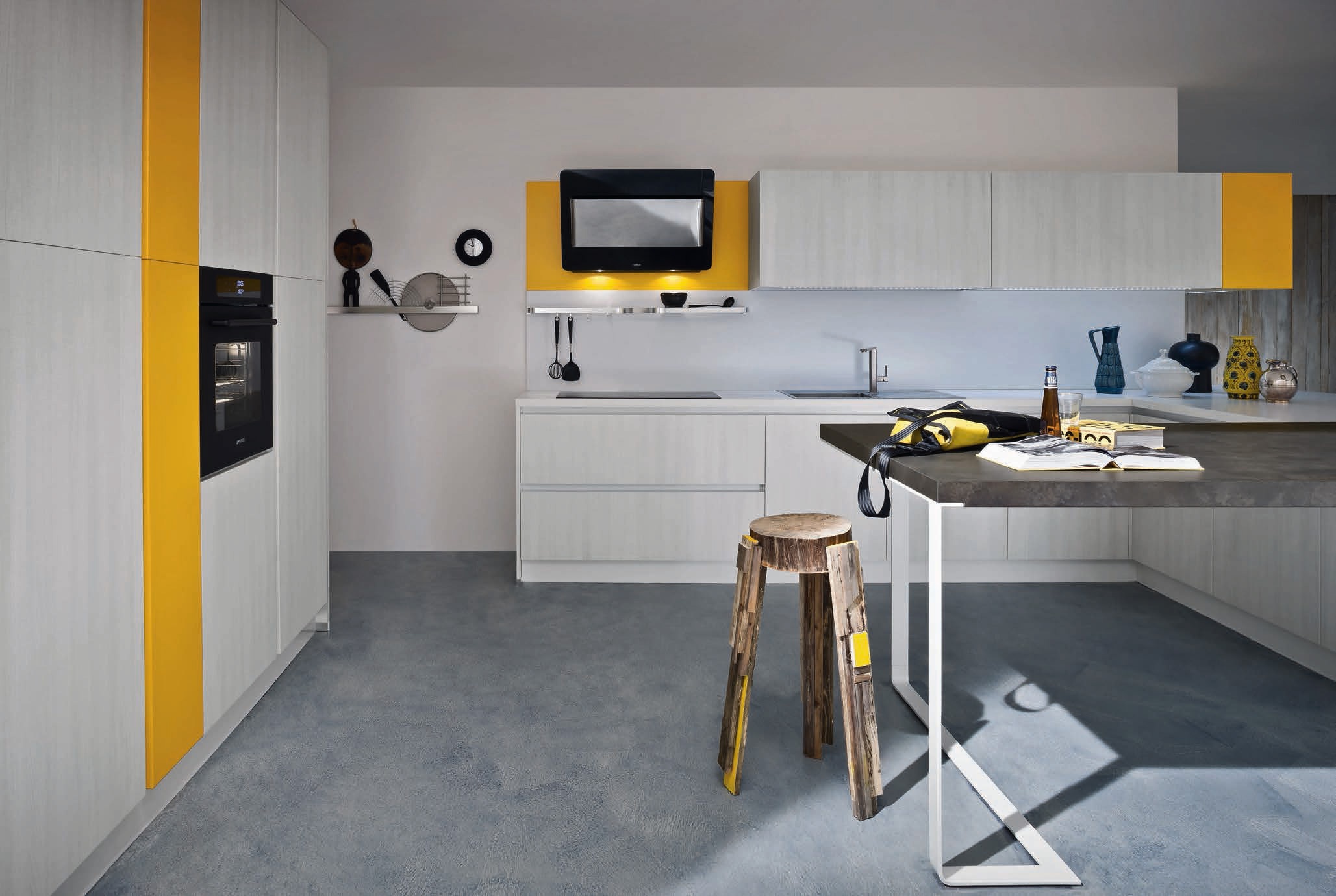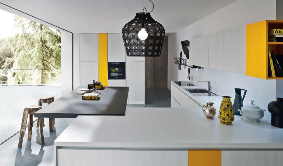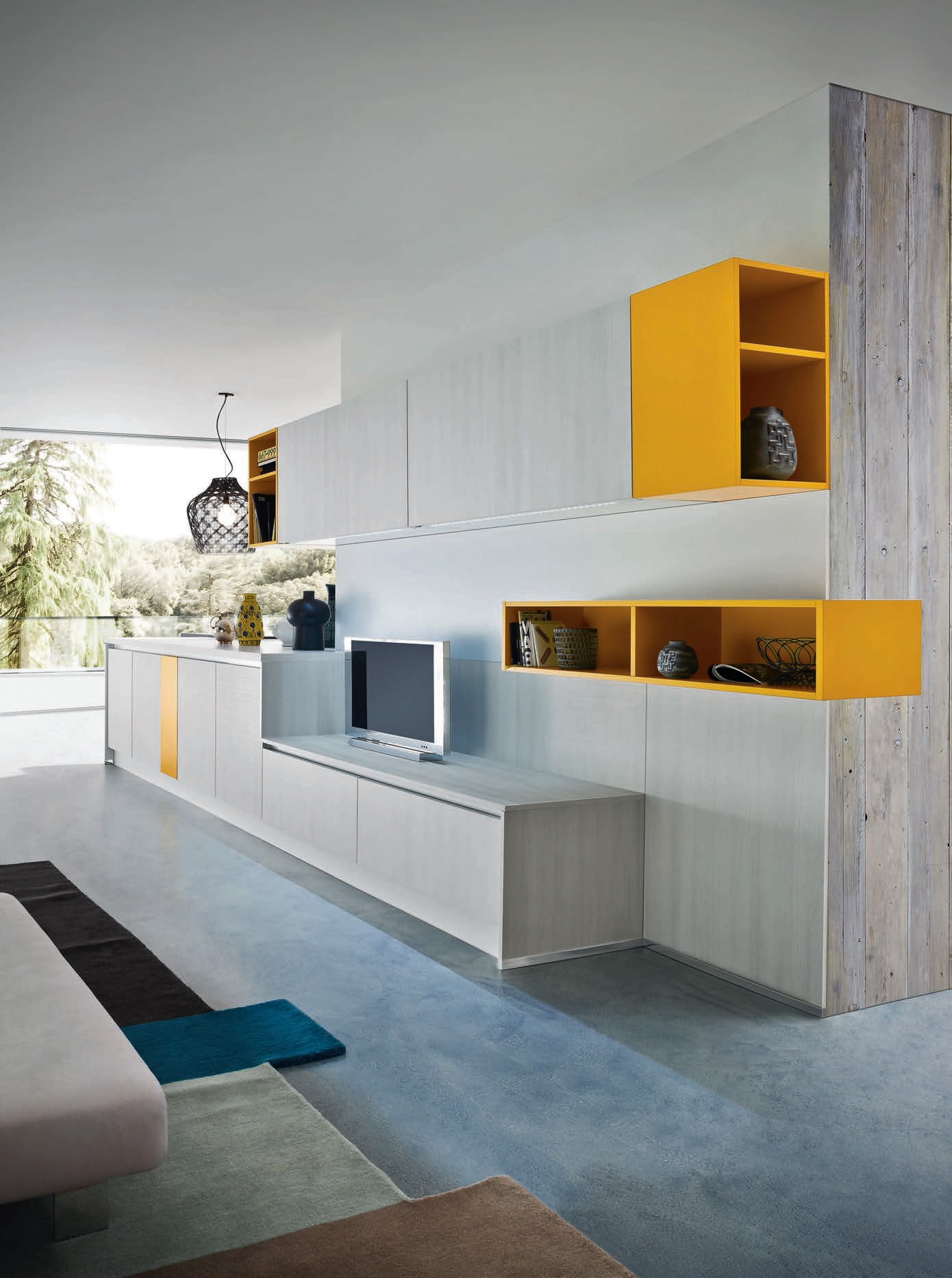 Set for kitchen Idea comp.3 from the Italian manufacturer Ar-Tre. Kitchen includes high columns, the lower elements, the system of mounted cabinets of various shapes and sizes, the bar and TV area. The material of the frame is water-repellent wood, fronts in veneer finish and Matt orange lacquer. Finish options to choose from for the company directory. The table-top working area is made of artificial stone white, bar in the finishing stone. Multi-purpose solution will satisfy the need for storage and optimum use of space. The modern style of execution.