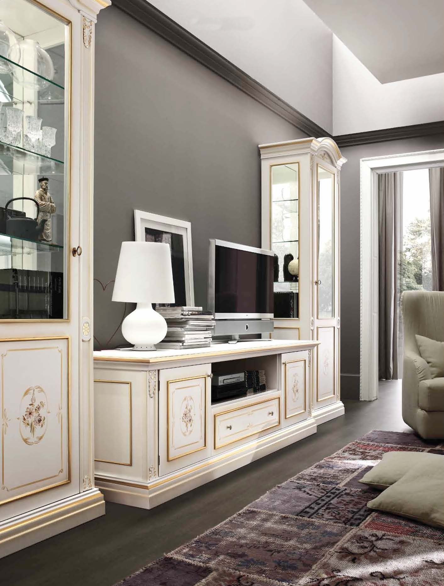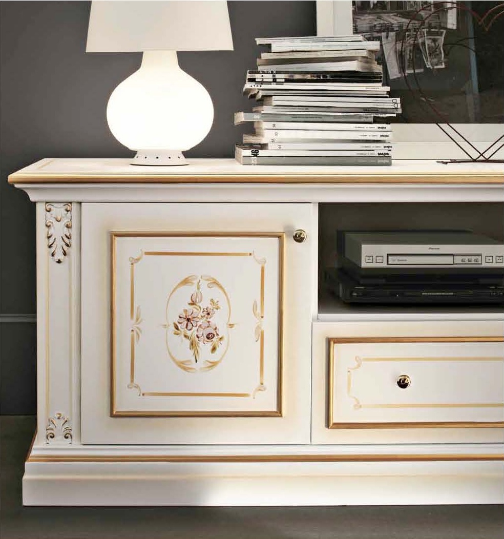 Cabinet for TV from Vivaldi Italian manufacturer Maronese. Model in the classic style, the frame is made of wood. The Cabinet has two wooden doors, one drawer, two wooden shelves and an open compartment. Cabinet for TV Vivaldi beautiful and necessary piece of furniture, which not only allows You to have the necessary things, but it will be a worthy decoration.