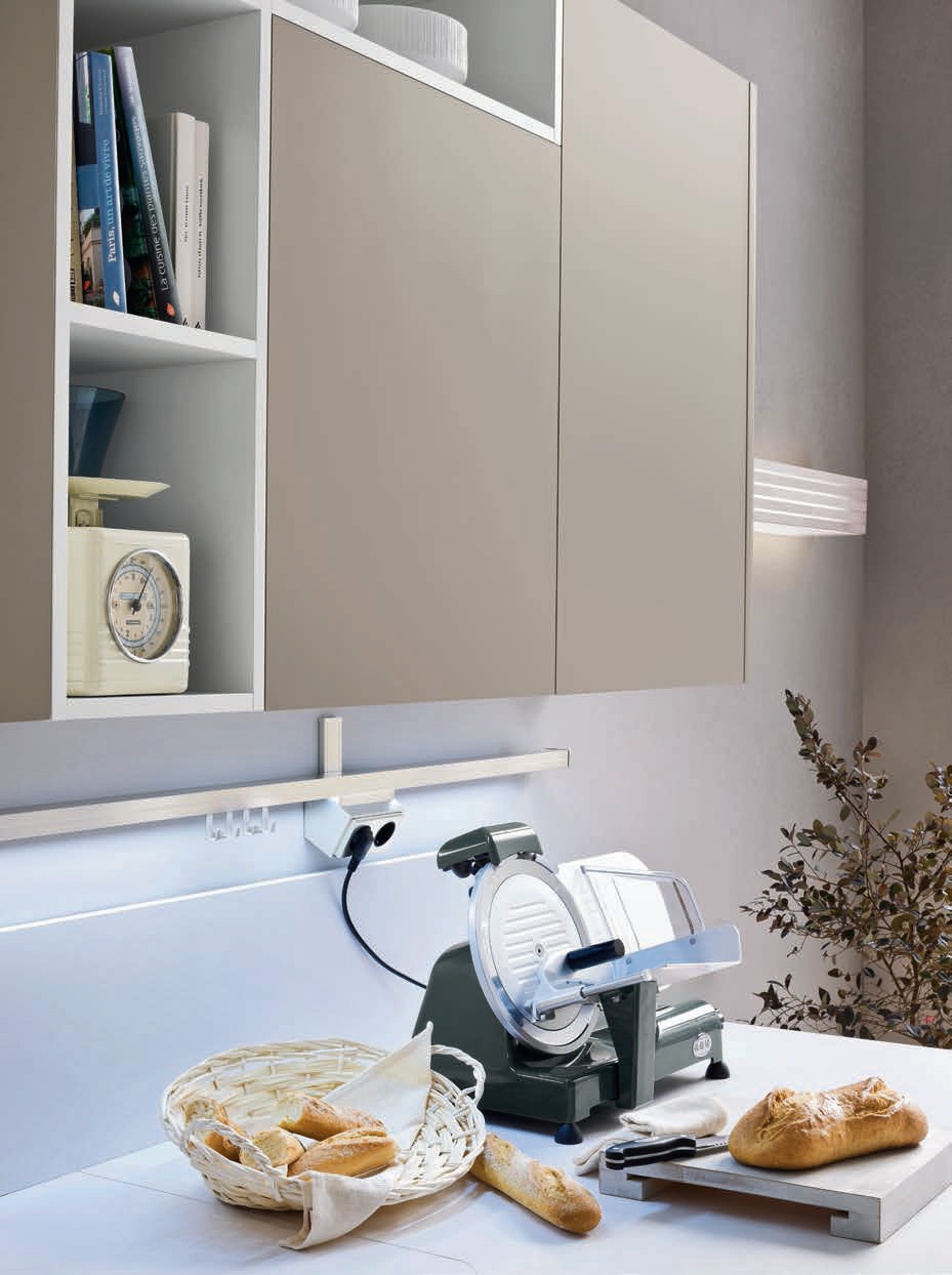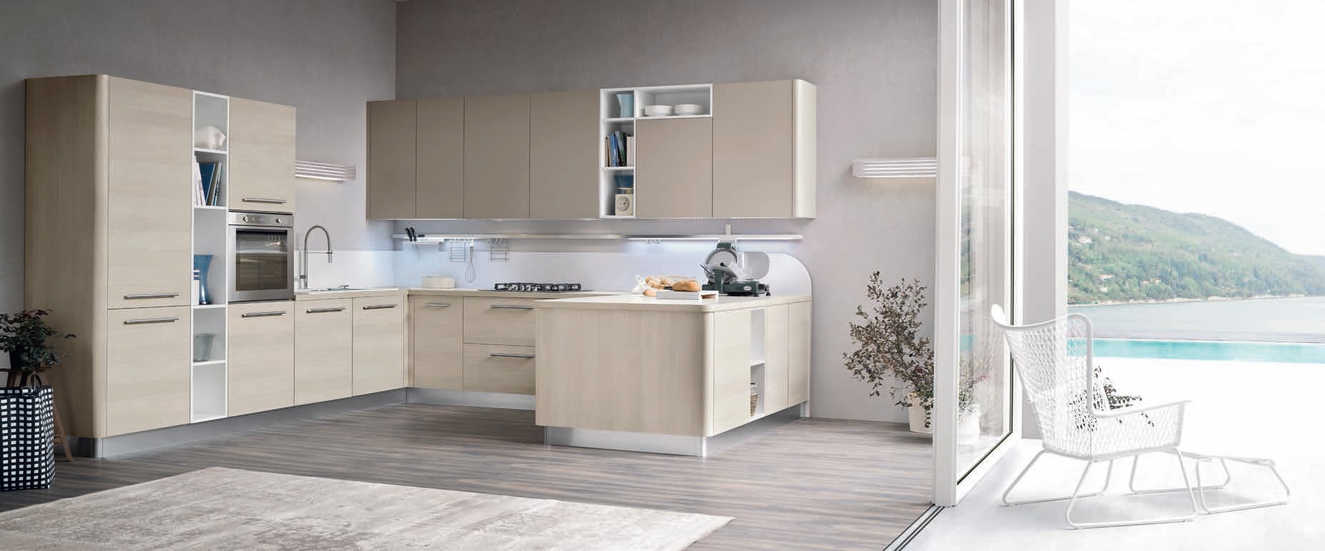 Kitchen Rio comp.2 from the Italian manufacturer Ar-Tre. The model is made of waterproof wood. The facades bleached oak with visible wood structure and Matt lacquer finish, metal handles. Countertop made of artificial stone. Built-in appliances. Colors to choose from manufacturer's catalogue. Practical kitchen set will certainly complement your modern kitchen interior.