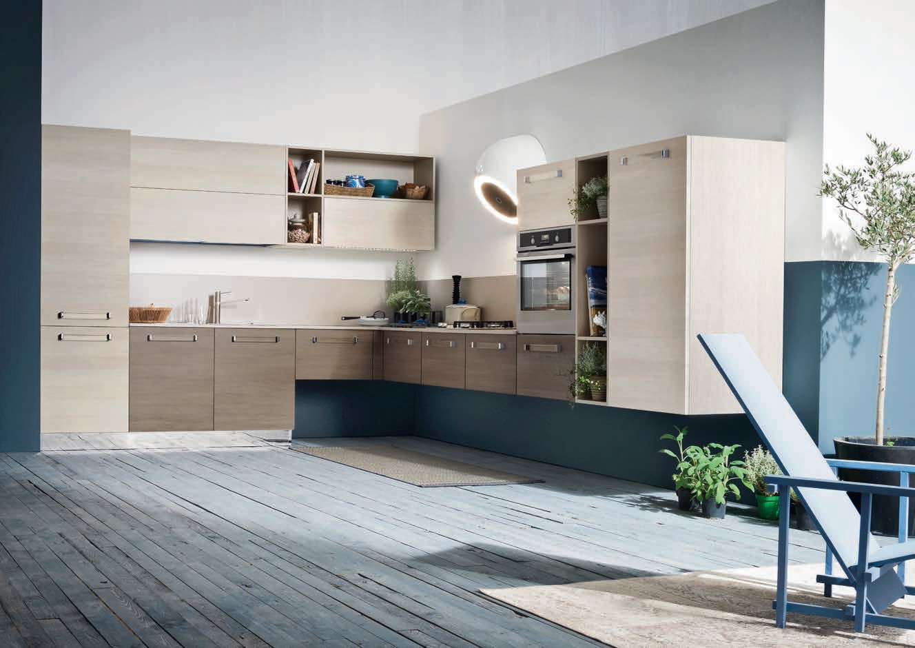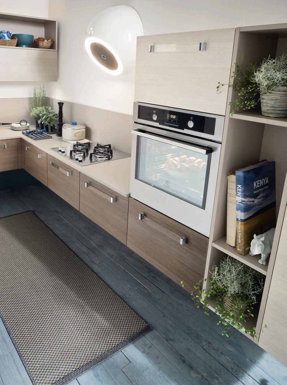 Kitchen Rio comp.5 from the Italian manufacturer Ar-Tre. The model is made of waterproof wood. The facades bleached oak and oak in beige tone with visible structure of wood, handle is metal. Countertop made of artificial stone. Built-in appliances. Colors to choose from manufacturer's catalogue. For your convenience, drawers, hanging system and open elements. Multifunctional and ergonomic solution for your kitchen in a modern style.