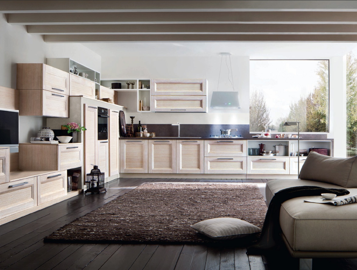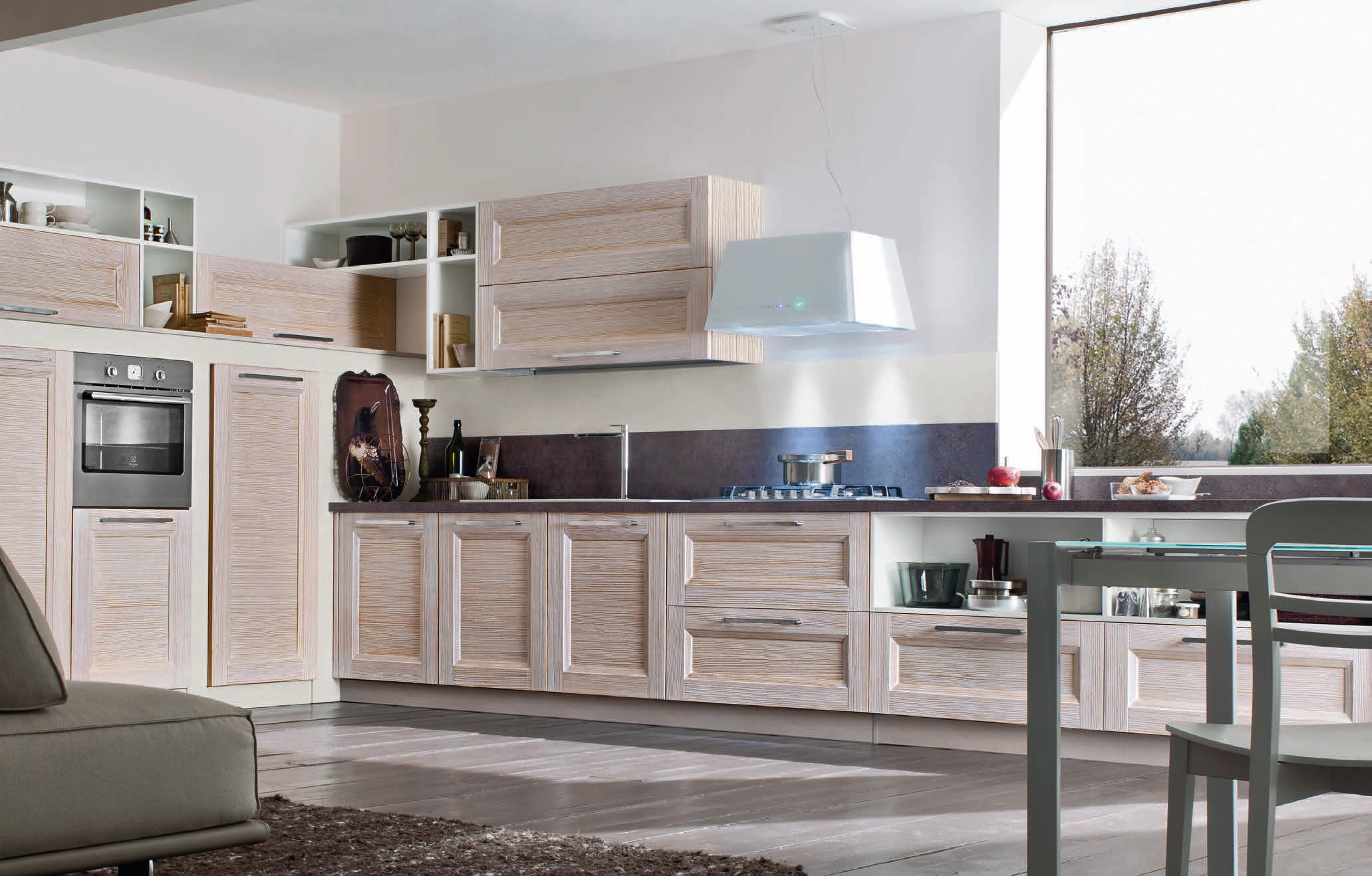 Kitchen Vela comp.1 from the Italian manufacturer Ar-Tre. The model is made of waterproof wood. Facades made of solid wood in the Department of lacquer with a corrugated wood structure, metal handle. Countertop made of artificial stone. The kitchen is equipped with drawers of different sizes, internal swivel shelves for convenience. Built-in appliances. Colors to choose from manufacturer's catalogue. Kitchen designed in modern style. Ergonomic and versatile solution for your kitchen, will satisfy the need for storage, and optimum use of space.