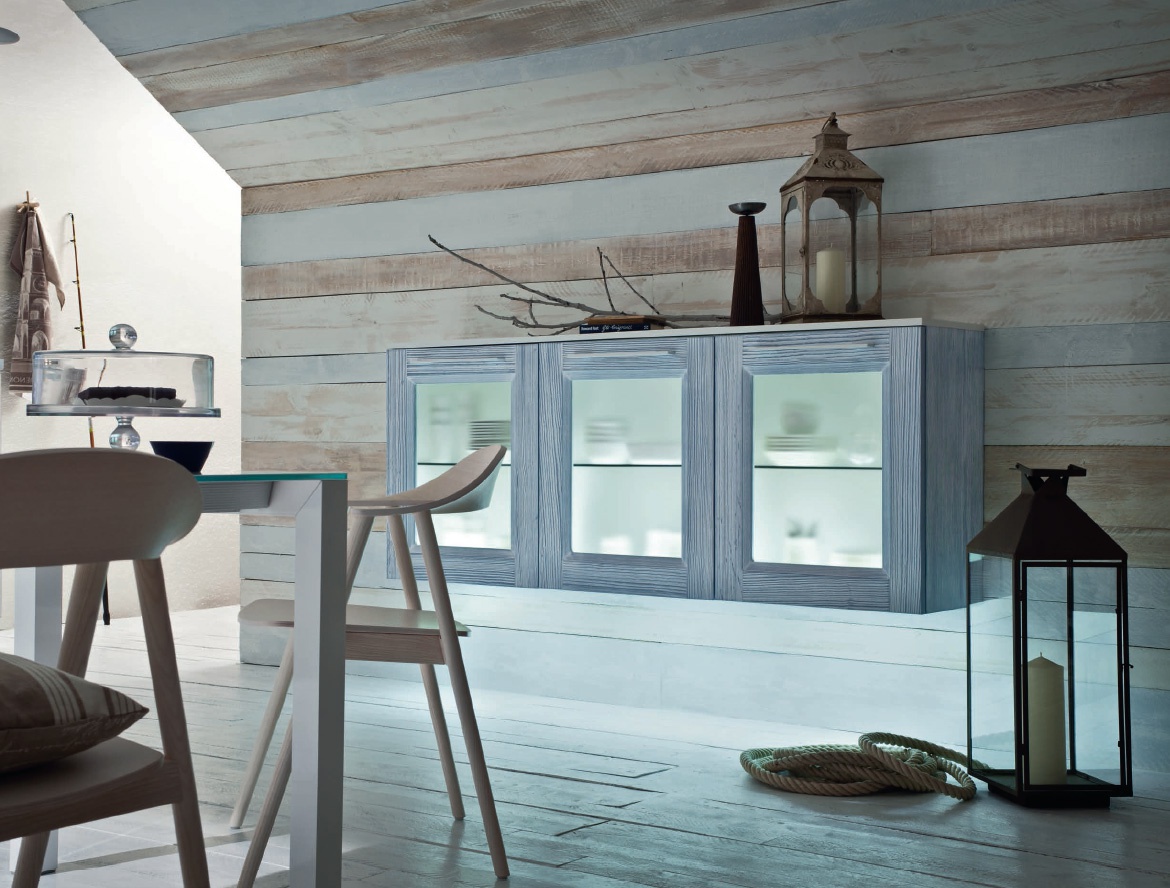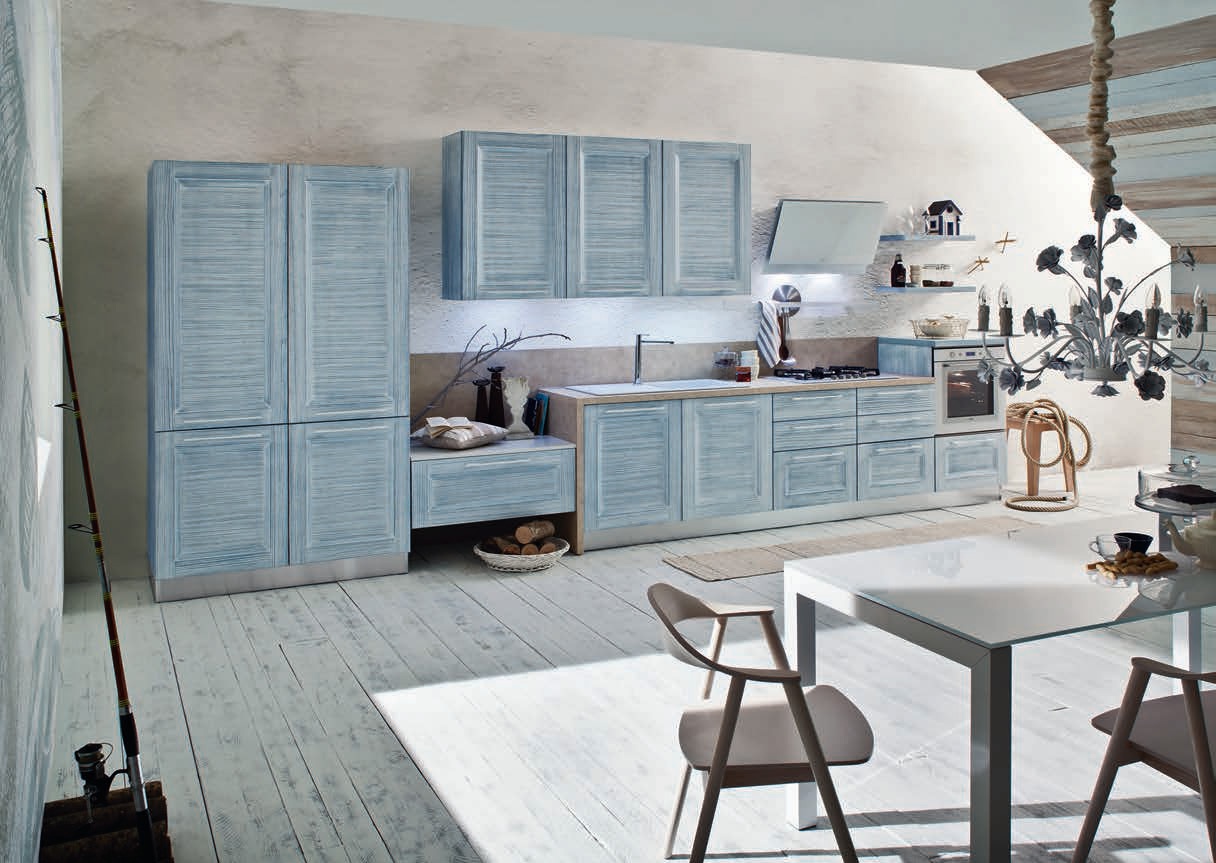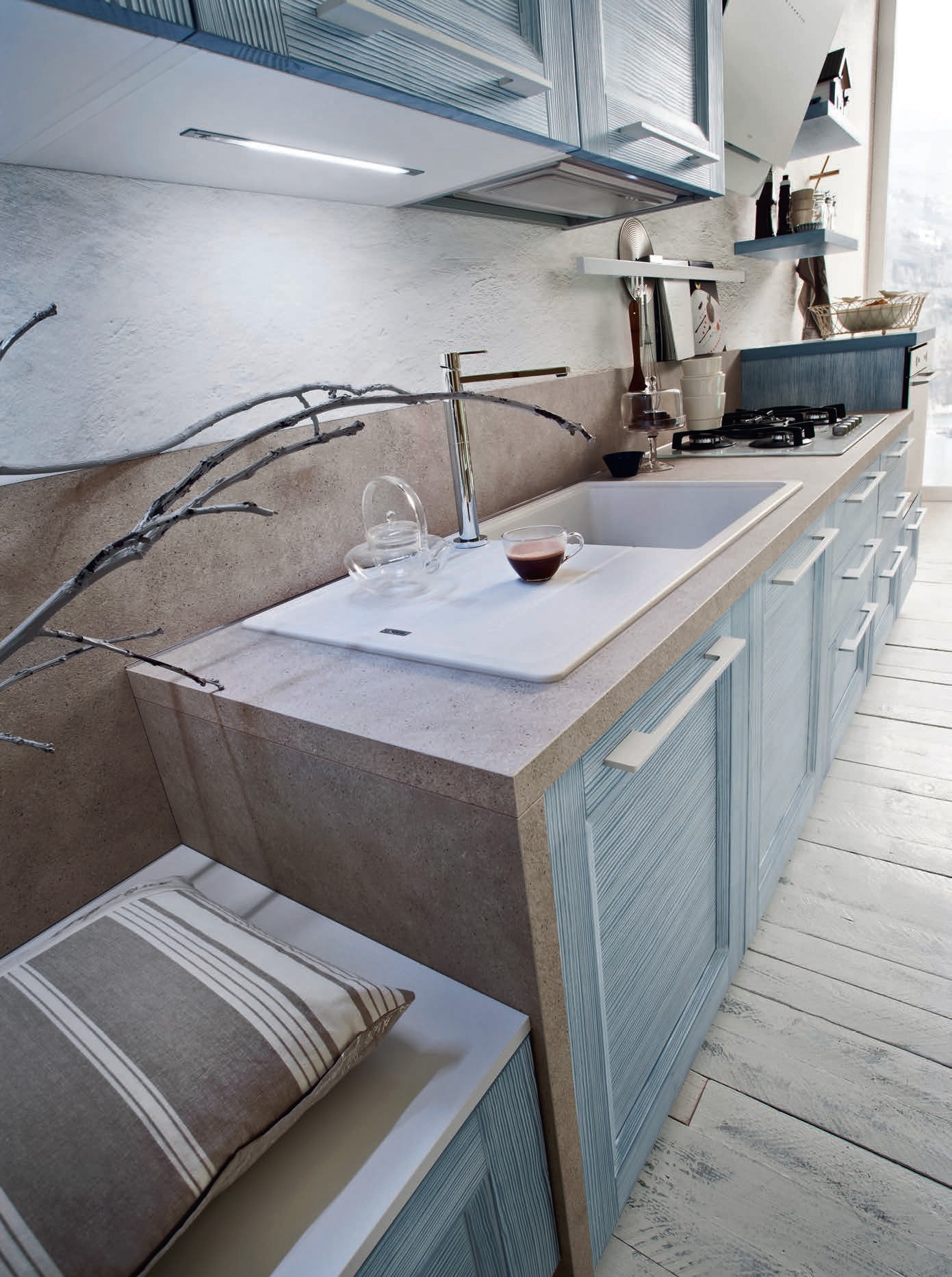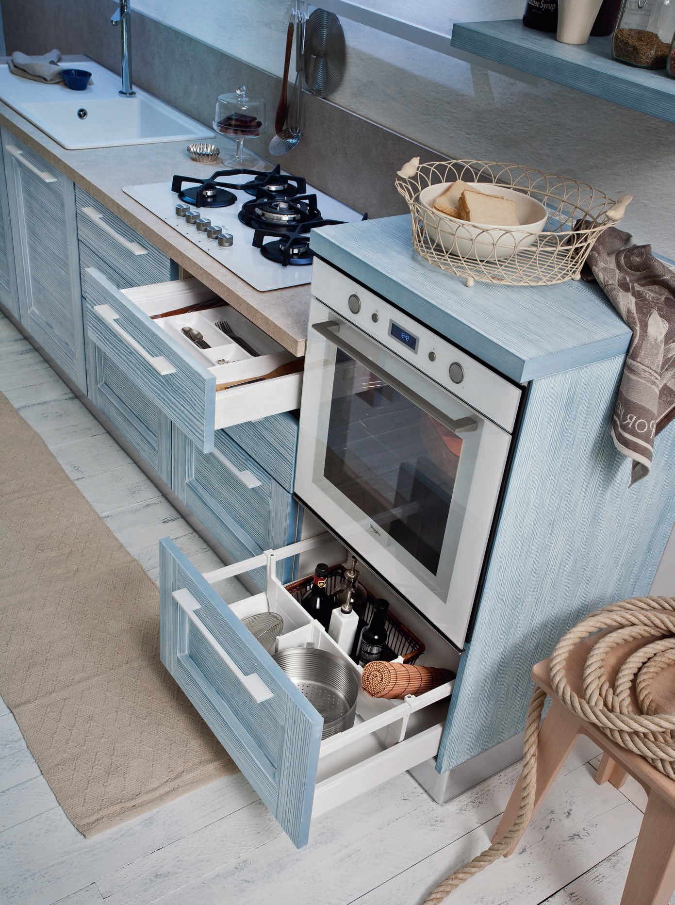 Kitchen Vela comp.2 from the Italian manufacturer Ar-Tre. The model is made of waterproof wood. Facades made of solid wood blue color in the varnish Department with corrugated wood structure, metal handle. Countertop made of artificial stone. The kitchen is equipped with drawers of various sizes. Built-in appliances. Colors to choose from manufacturer's catalogue. Kitchen designed in modern style. Ergonomic and versatile solution for your kitchen.