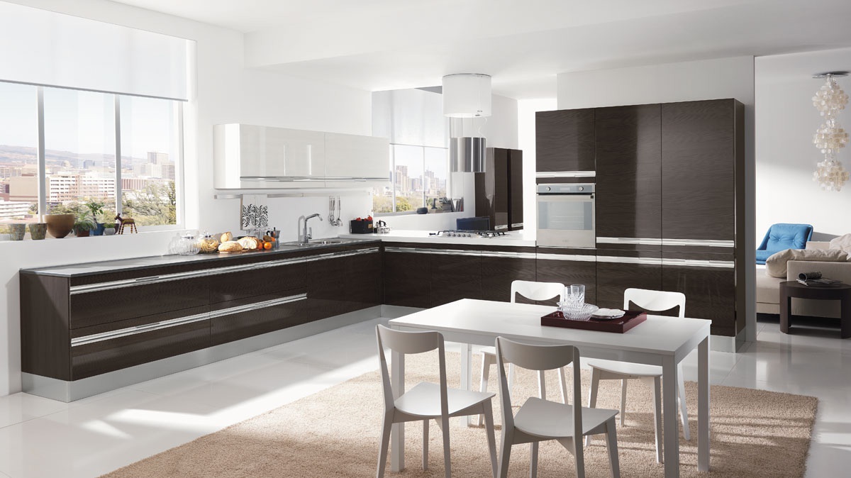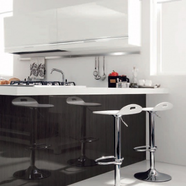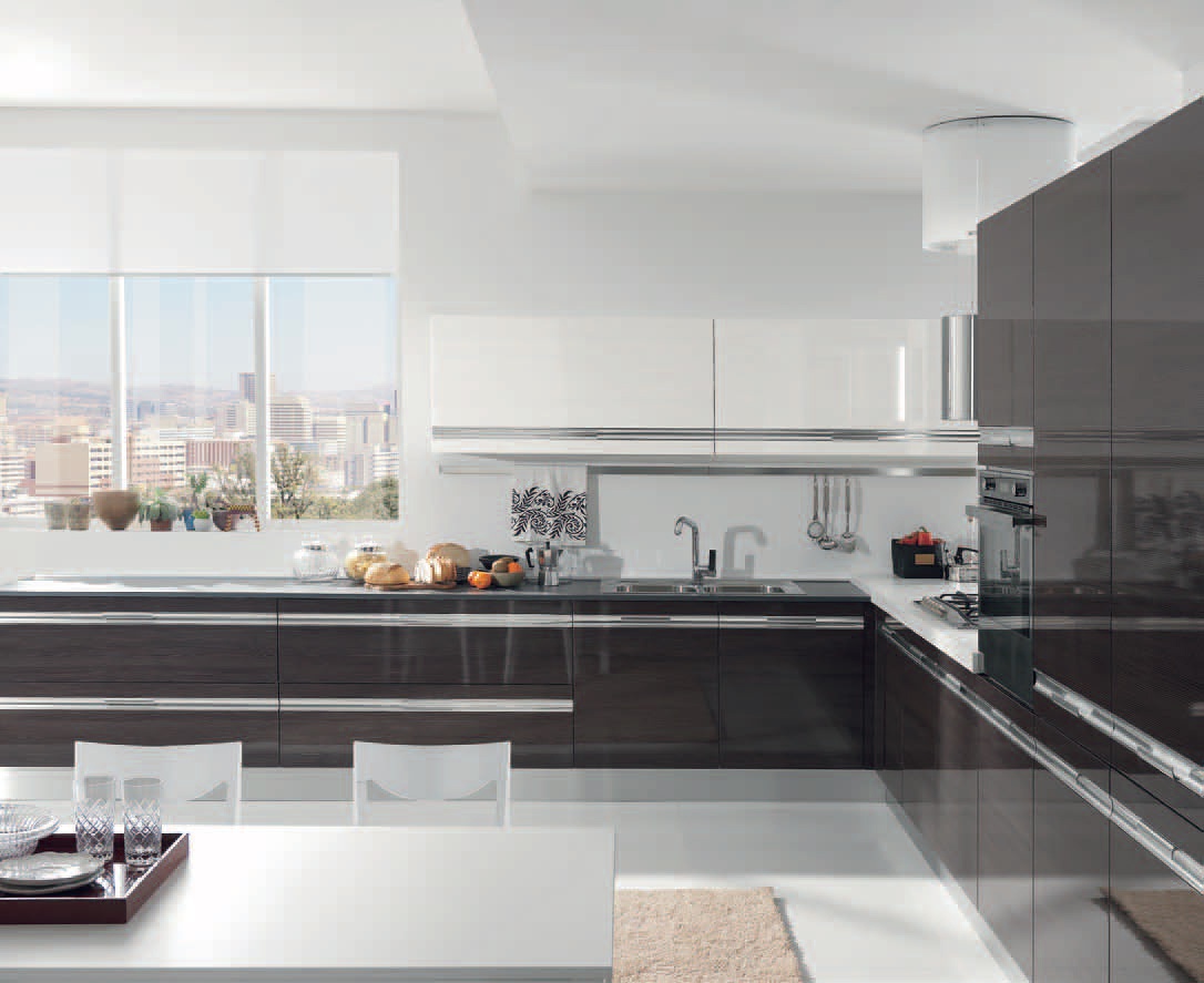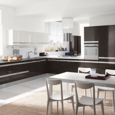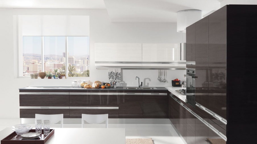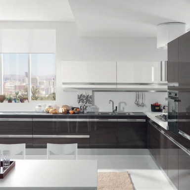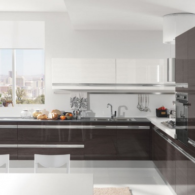 Kitchen (kitchen set) Tenes Evo from the Italian manufacturer Aran Cucine. The model is made in modern style. The facade of polished red wood and glossy white. Absolute design, created on light gotten and sustainable lines. Tenes Evo is a revision of one of the most valuable patterns Aran, characterized by a special abrasion resistance, ability to organize space, the choice of colors and originality.