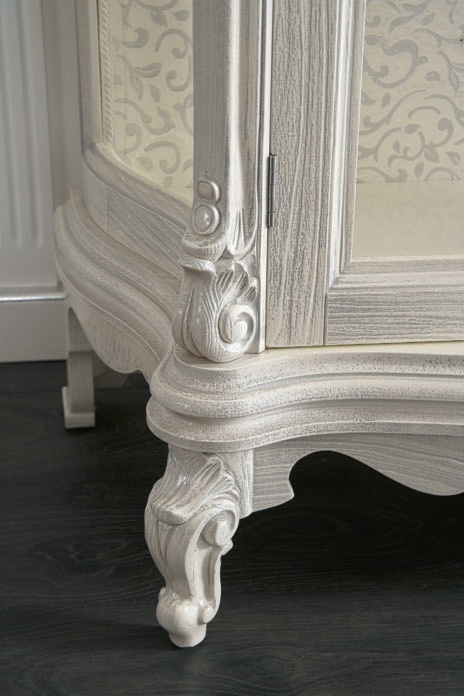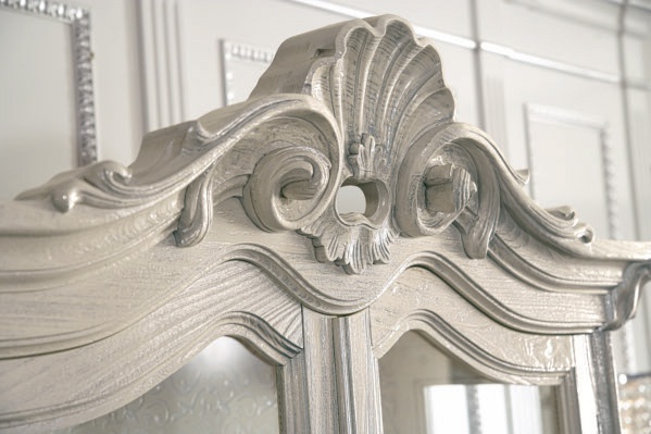 Showcase from Italian manufacturer Mirandola Export. The model with two swinging doors. The frame is made of wood and decorated with carvings. Finish: M38+M27 with Gray & White paintings. Shelves, side panels and doors are made of glass. The design is executed in classical style.