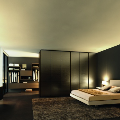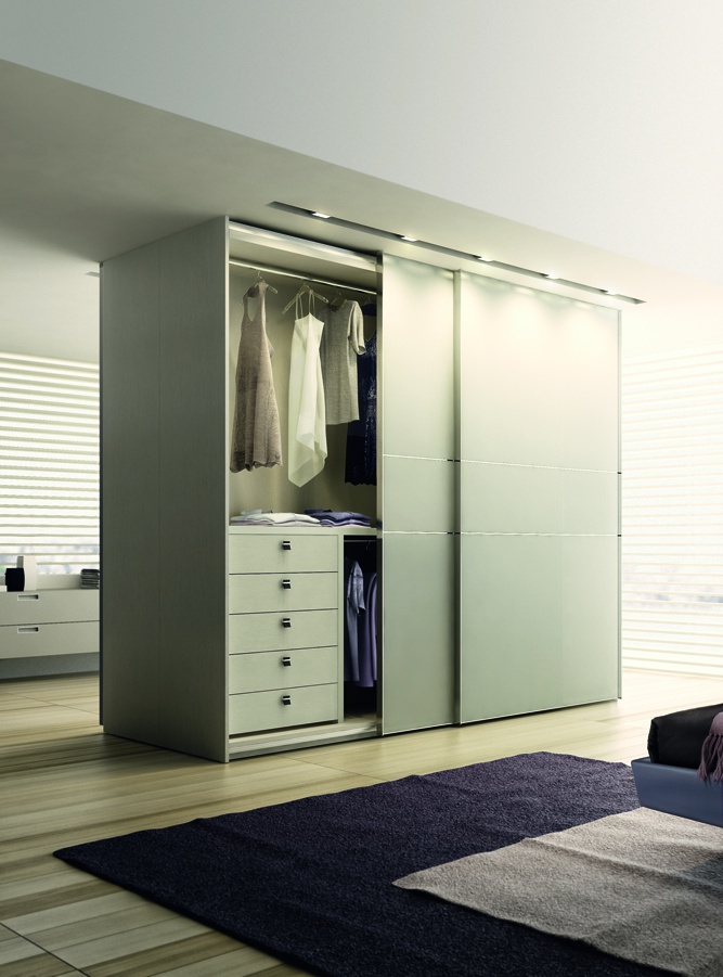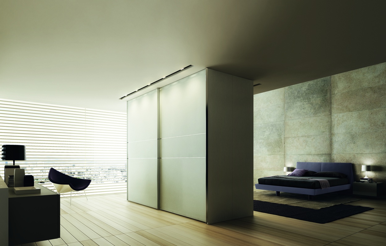 Spacious wardrobe Motus from the Italian manufacturer Falma Italia, will fit perfectly in a modern bedroom interior. Factory offers several finishing options - painted glass, natural wood veneer, lacquer.Filling Cabinet can be formed at the request of the client.