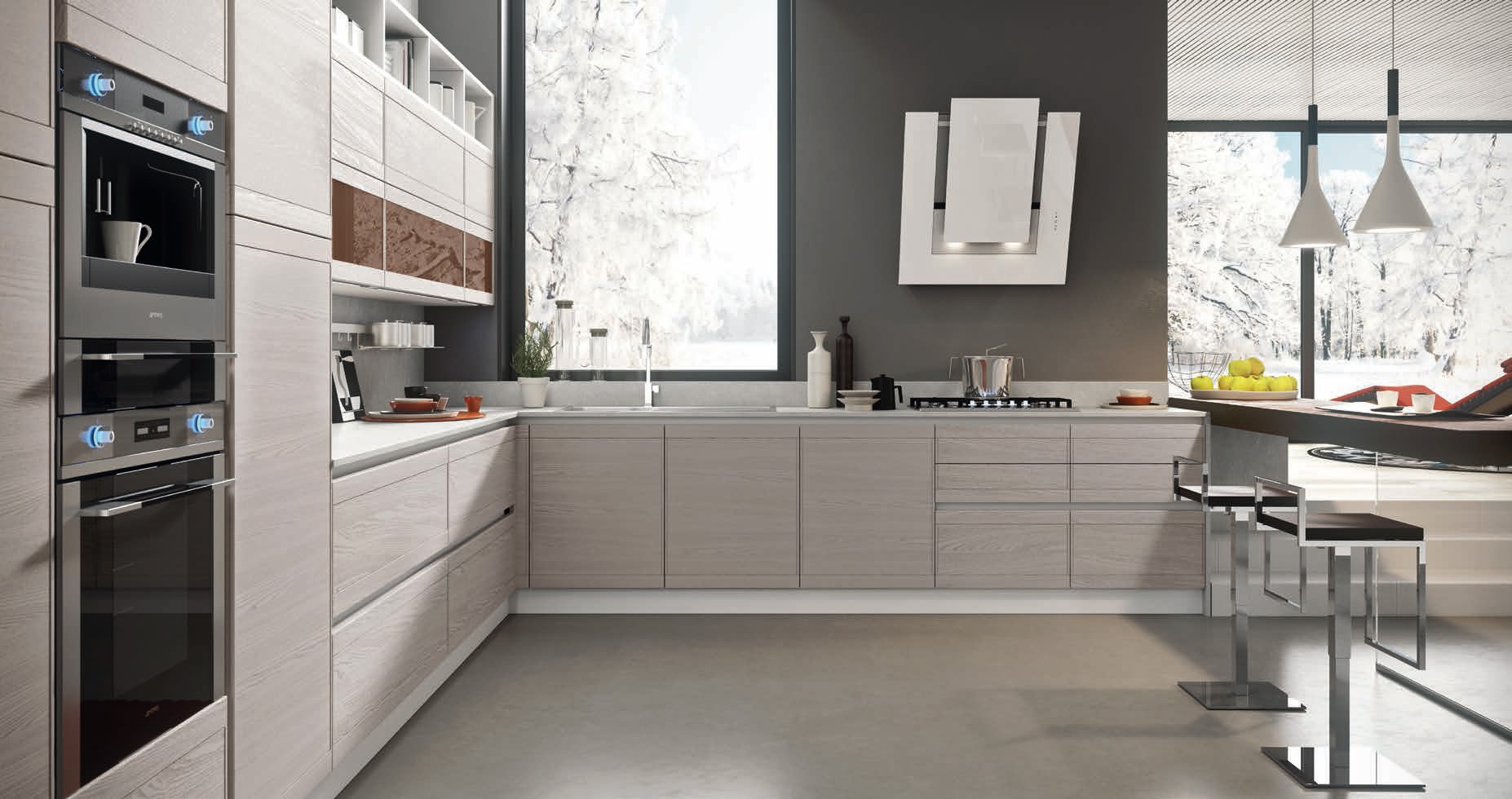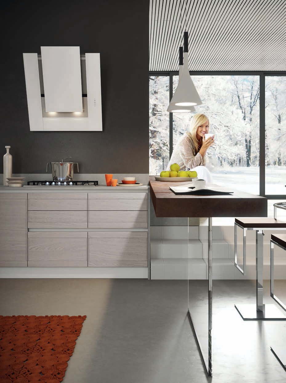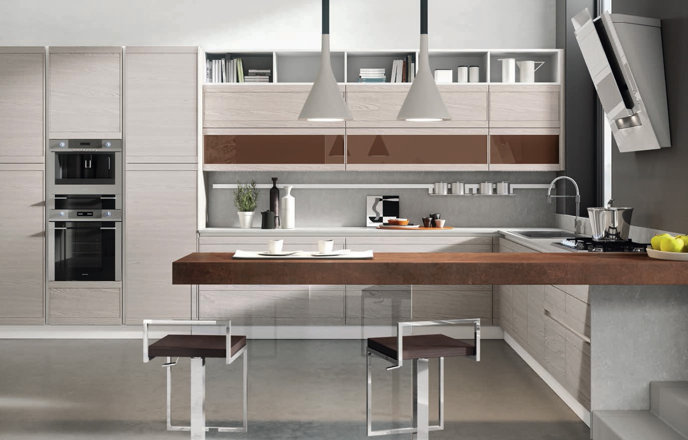 Kitchen Zoe comp.4 from the Italian manufacturer Ar-Tre. The model is made of waterproof wood. The facades decapitating ash and lacquered glass in color mocha, pen-goal. The table-top working area of the laminate with the effect of the cement bar counter made of ceramics on the basis of tempered glass. Built-in appliances. Colors to choose from manufacturer's catalogue. Practical and modern kitchen design, harmoniously combines living room and kitchen area.