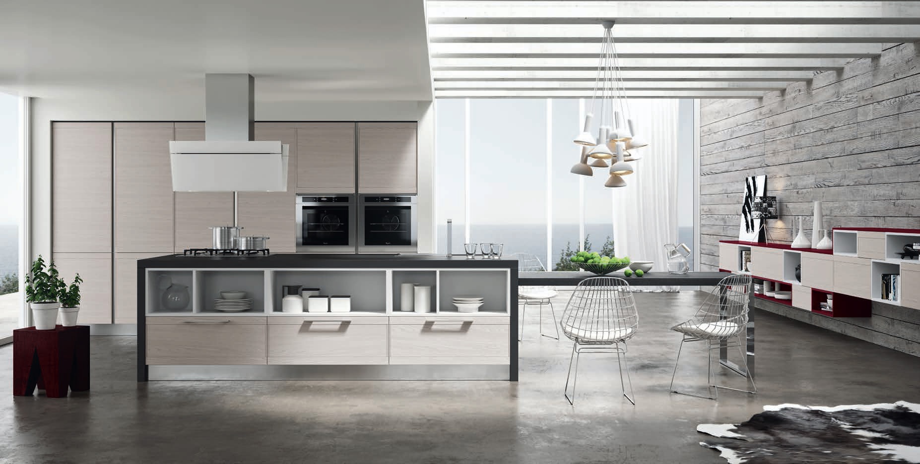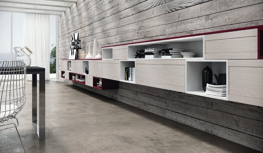 Kitchen Zoe comp.5 from the Italian manufacturer Ar-Tre. The model is made of waterproof wood. The facades decapitating ash, open modules in Matt lacquer white and Burgundy color, metal handle. Countertop made of artificial stone. Built-in appliances. Colors to choose from manufacturer's catalogue. Practical and multifunctional solution for your modern kitchen.