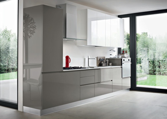 Kitchen Flo comp.6 from the Italian manufacturer Ar-Tre. The headset frame is made of waterproof wood. Fronts made of MDF in high gloss lacquered finish, white tone and color of cement, the handles are recessed into the door. The table top is made of corian white. Built-in appliances. Colors to choose from manufacturer's catalogue. Kitchen drawers full of elements and content. Functional and ergonomic solution for kitchen in the modern style.