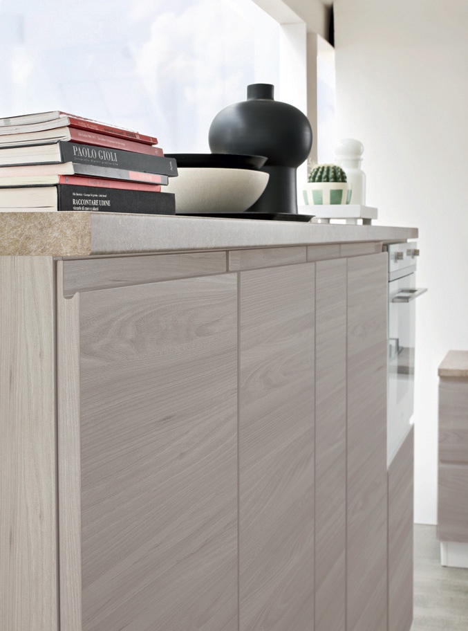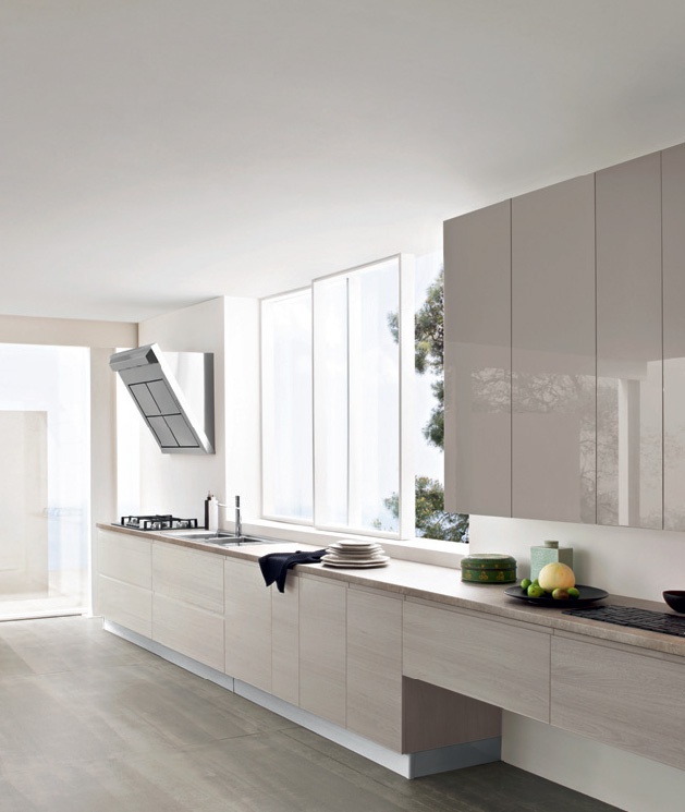 Kitchen Flo comp.7 from the Italian manufacturer Ar-Tre. The headset frame is made of waterproof wood. The facades of solid elm in a gray tone and high-gloss lacquer beige, the handle is indented in the door. Countertop made of artificial stone. Built-in appliances. Colors to choose from manufacturer's catalogue. Kitchen designed in modern style.