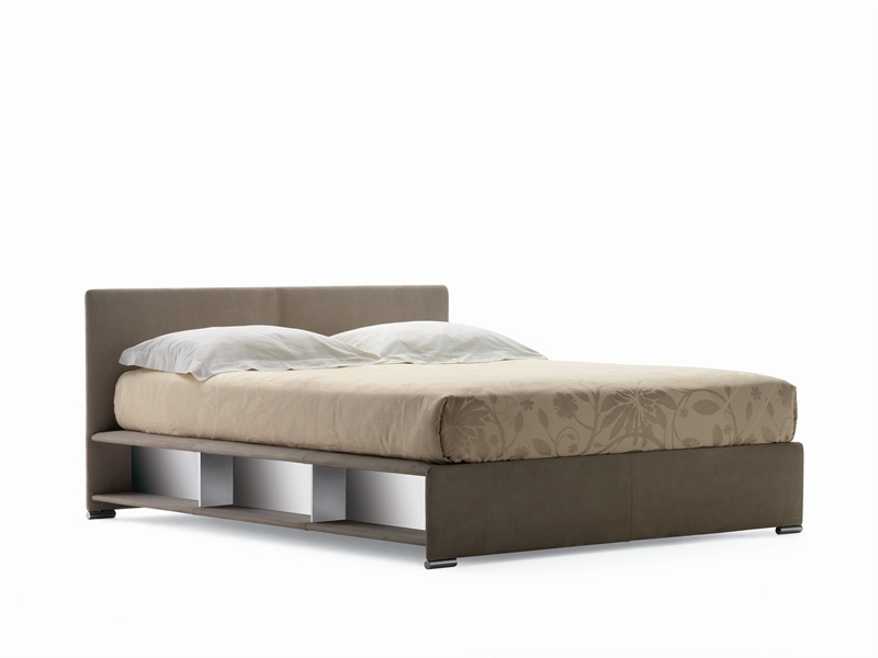 Salina bed from Italian manufacturer Flou. The frame is made from solid oak, upholstered in natural leather or textiles from a range of campaigns. Under the bed is a compartment for storage of bedding. The feature of design bookshelves built into the sides of the frame. Single, double model with upholstered headboard for the bedroom is designed in modern style. Colors: brown, natural color of the wood.