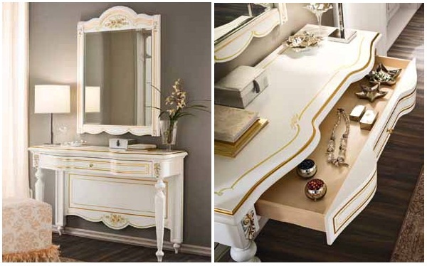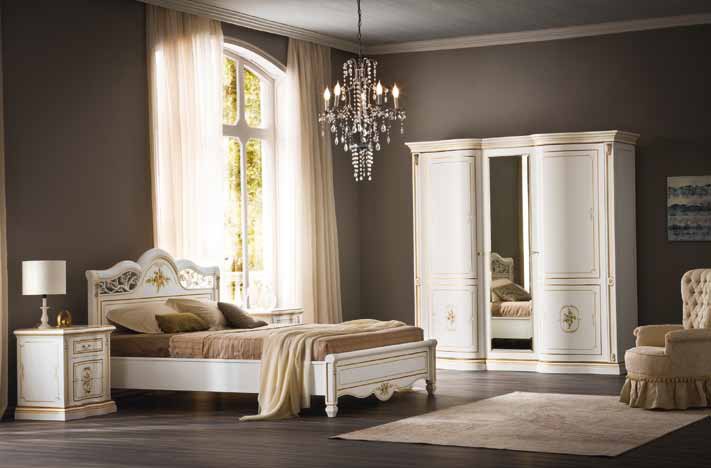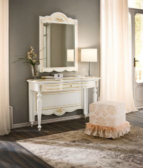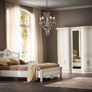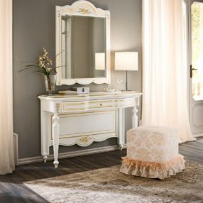 Set to Vivaldi bedrooms from Italian manufacturer Serenissima. Set consists of a double bed with tall carved headboard, wardrobe with mirror, dressing table, pouf with a cover made of textile. Set is made of solid wood, coating is white paint. The decor speaks of fine carving and gilding. Accessories metal. Set in a classic style. Elegant smooth shapes is the main feature of this collection. Set will fill your bedroom with elegance and uniqueness.