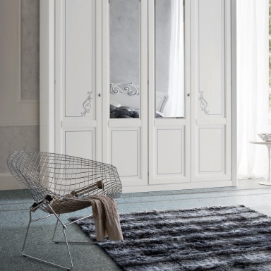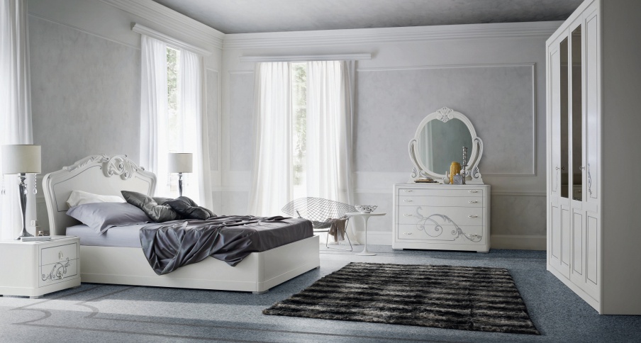 Set for bedroom Provenza from the Italian manufacturer Serenissima. Set consists of a double bed with tall carved headboard, bed-side tables, left and right, chest of drawers, wardrobe four-door wardrobe with mirror, dressing table, round mirror at the base of the bench in eco leather. Set is made of solid wood, coating is white Matt lacquer. The decor speaks of fine carving, painted silver. Accessories metal. Set of classic style with a modern edge. Elegant shapes are skillfully combined with modern functionality. Set will fill your bedroom with elegance and uniqueness.