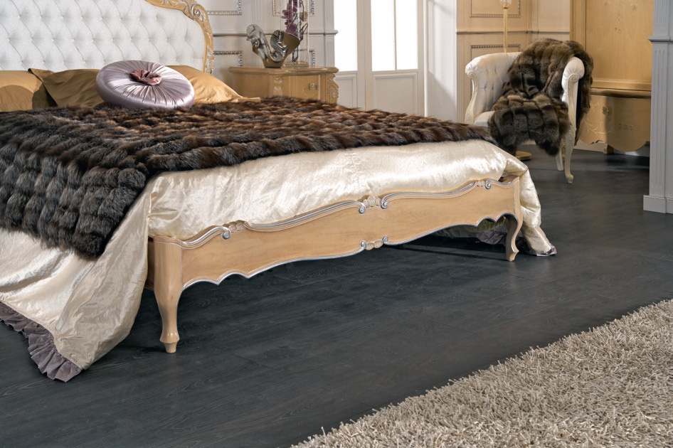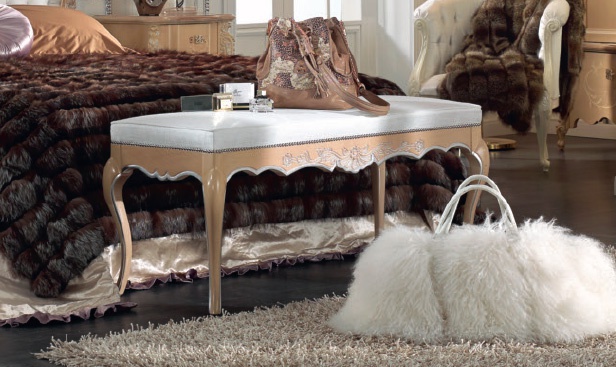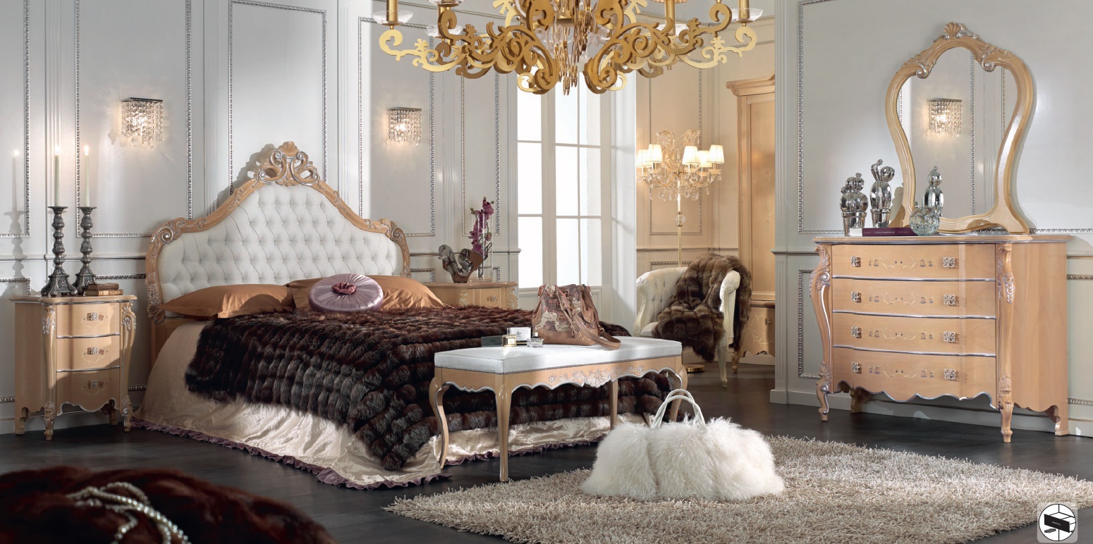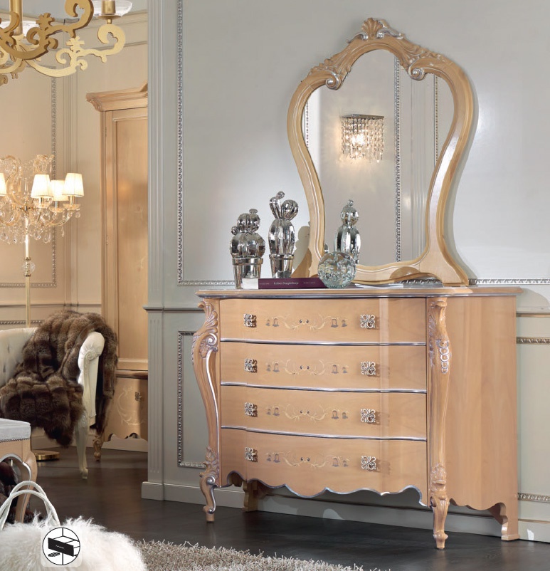 Bedroom (Suite bedroom) from the Italian manufacturer Mirandola Export. Set includes: double bed, bedside nightstand, bench, dresser and mirror. The furniture is made of wood. Decoration is carved and silver elements. The upholstery is made of textile cloth. A style classic.