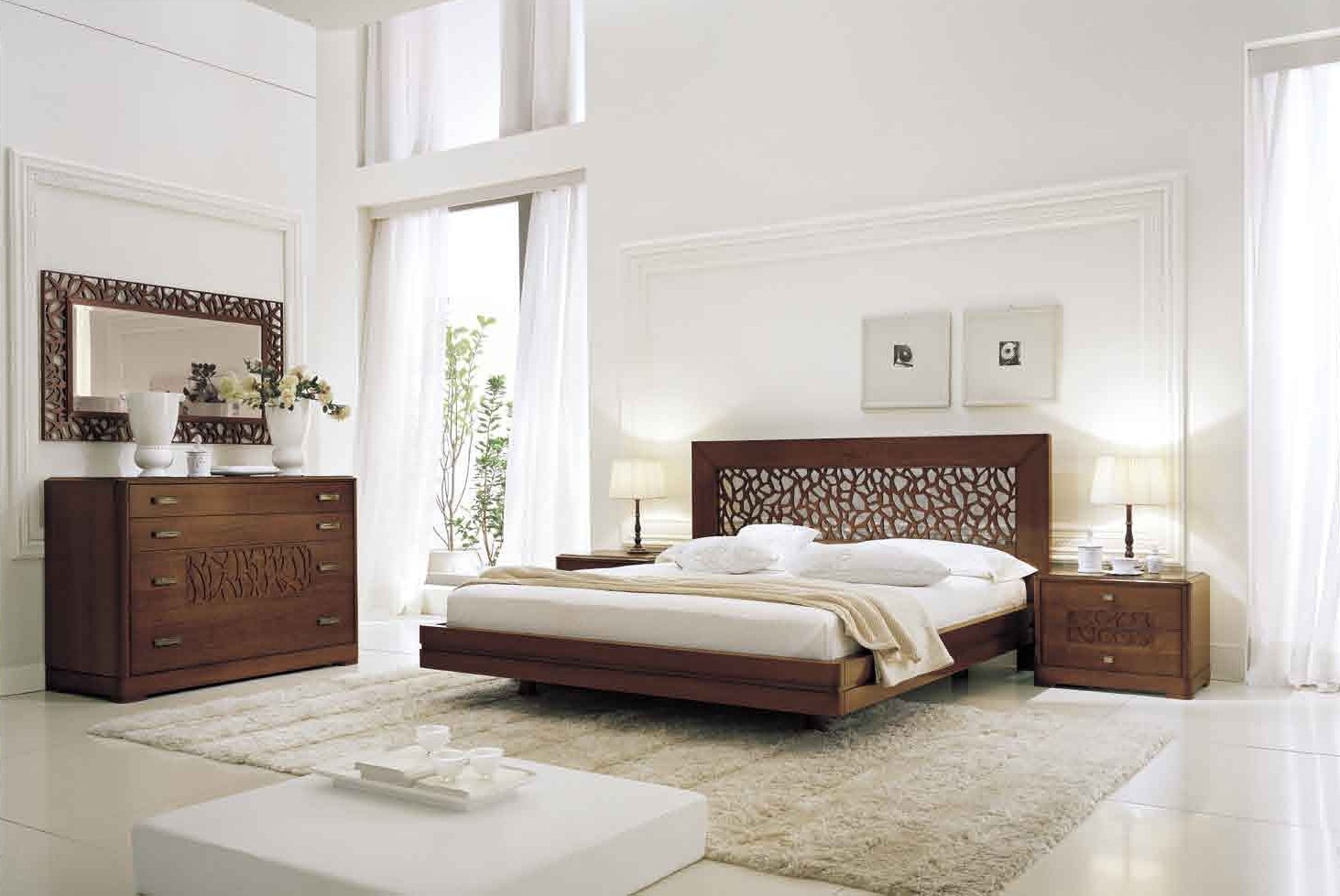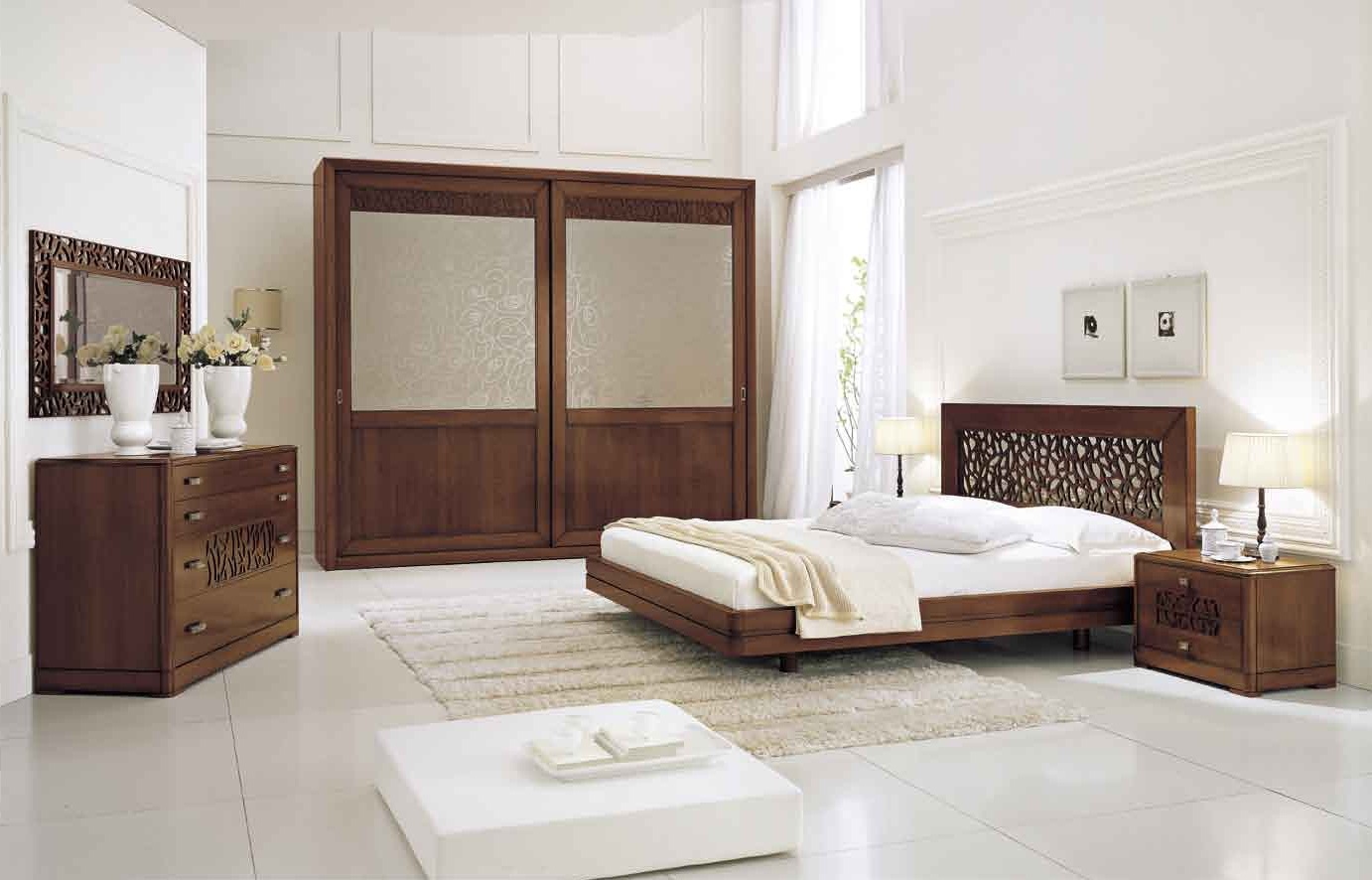 Set for bedroom Lago di garda noce from the Italian manufacturer Serenissima. Set consists of a double bed with tall carved headboard (also available with containers), bedside tables, chest of drawers, a two door wardrobe with mirrors ( decorated by silk screen printing by request) and wall mounted mirrors. Set is made of solid wood, finishing walnut. The decor speaks of fine thread. Accessories metal. Set of neoclassic style, with exquisite relief, rich in exquisite details.