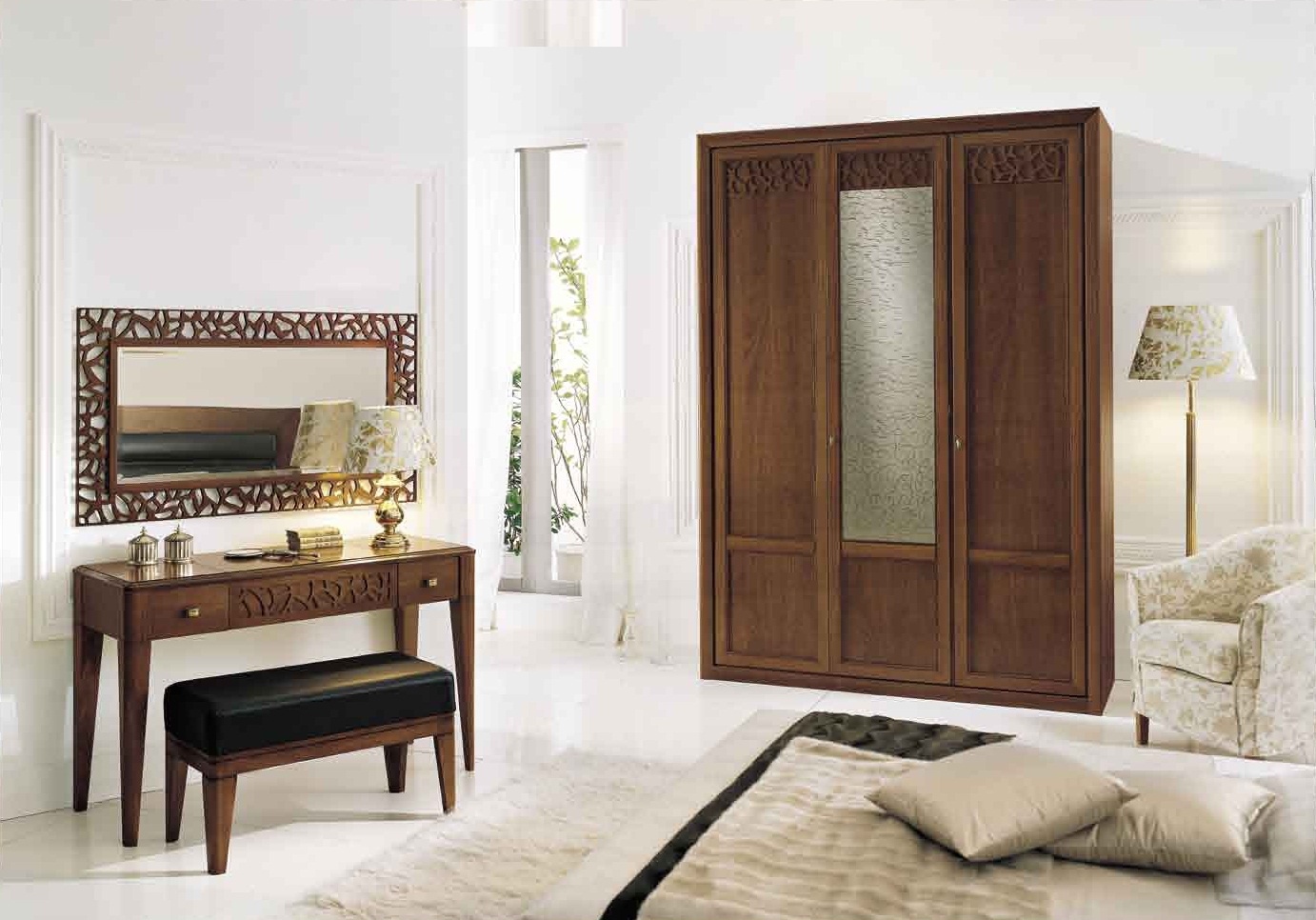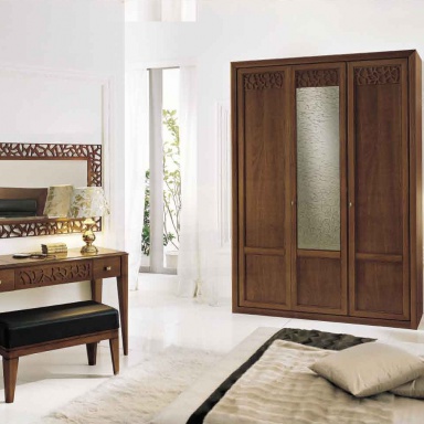 Set for bedroom Lago di garda noce from the Italian manufacturer Serenissima. Set consists of double bed with upholstered headboard in leather (with containers), a five-door and three-door wardrobe with mirror ( decorated with silk screen printing by request), dressing table with built-in under countertop with mirror and pouf in leather. Set is made of solid wood, finishing walnut. The decor speaks of fine thread. Accessories metal. Set of neoclassic style, with exquisite relief, rich in exquisite details.