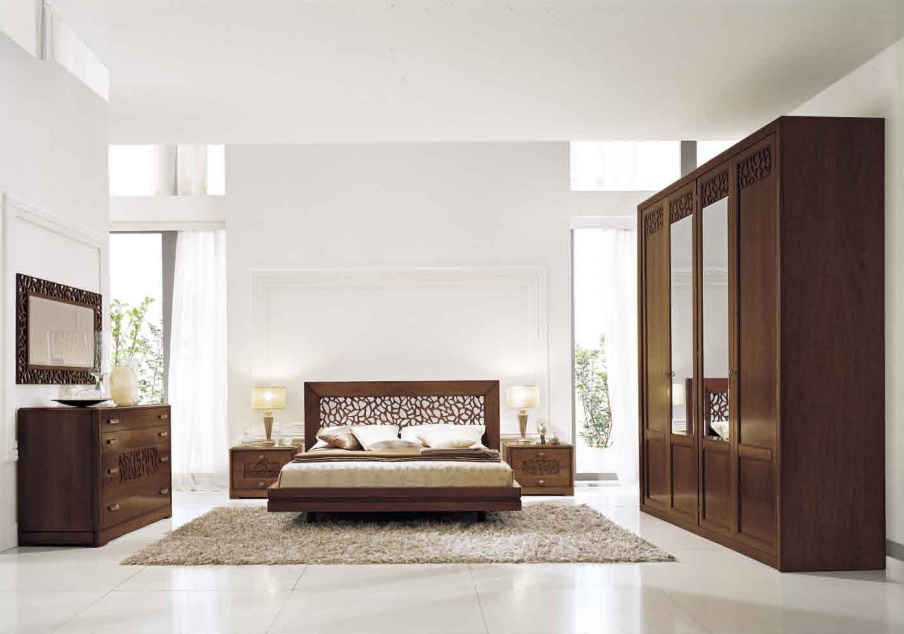 Set for bedroom Lago di garda noce from the Italian manufacturer Serenissima. Set consists of a double bed with tall carved headboard (model with drawers), a four-door wardrobe with mirrors (with silk-screen printing on request), chest of drawers, wall mirror, bedside tables. Set is made of solid wood, finishing walnut. The decor speaks of fine thread. Accessories metal. Set of neoclassic style, with exquisite relief, will fill the bedroom warmth and comfort.