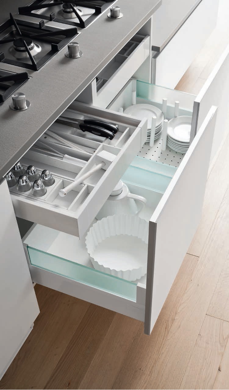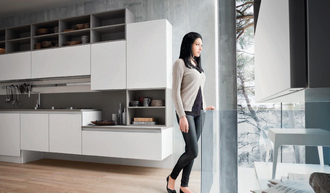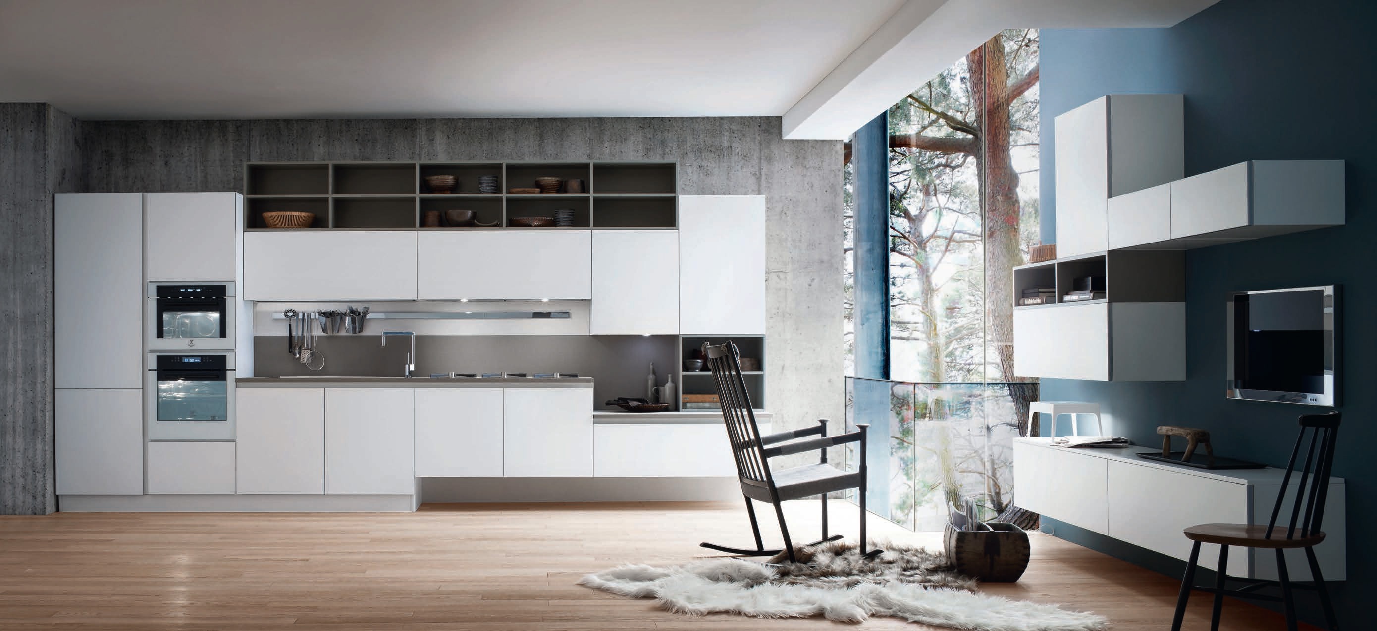Kitchen Luna comp.1 from the Italian manufacturer Ar-Tre. The model is made of waterproof wood. Facades of MDF in a white Matt lacquer finish colors, pen-goal. Countertop made of quartzite. Built-in appliances. Colors to choose from manufacturer's catalogue. This kitchen has drawers, open and suspended elements. Combines a living area and kitchen, expresses a new concept in modern style.