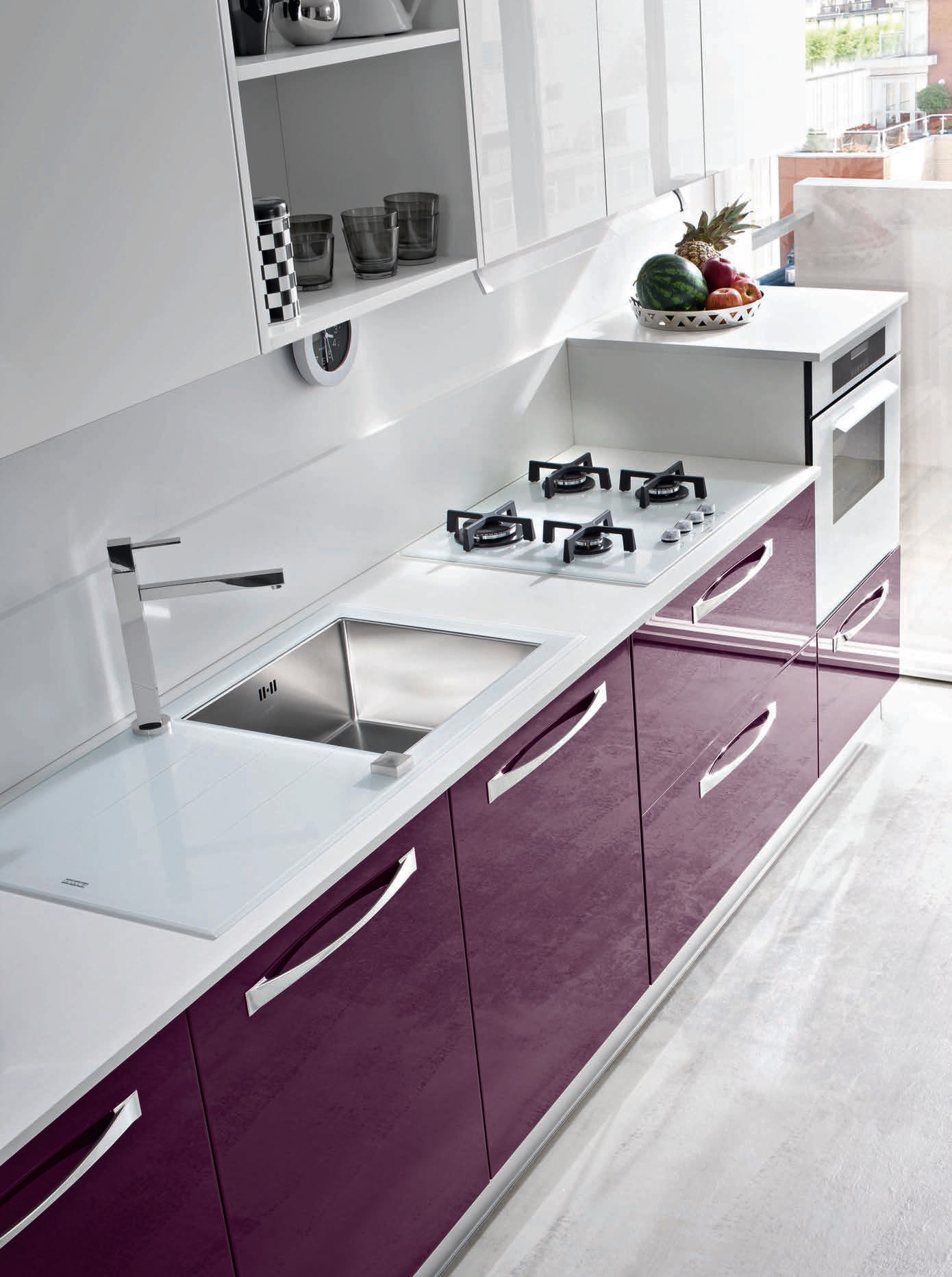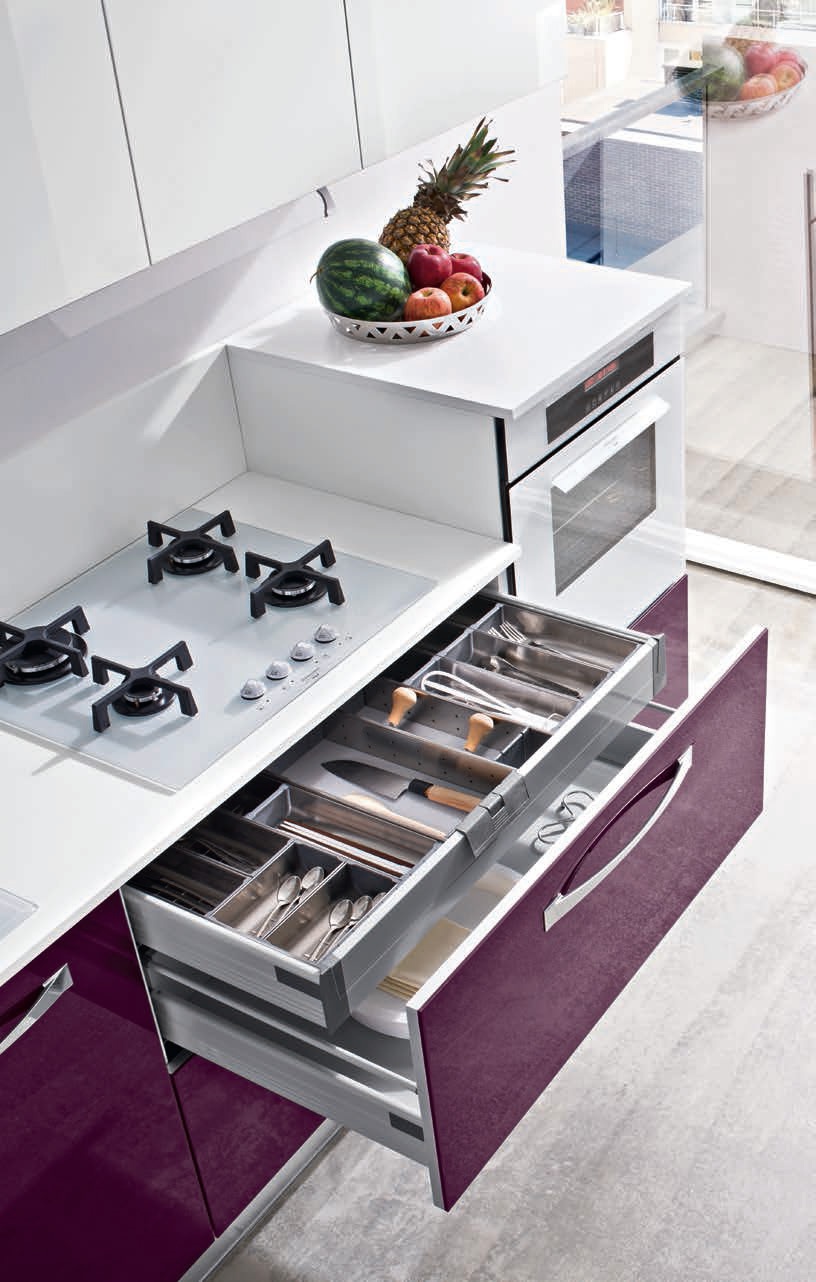 Kitchen Luna comp.5 from the Italian manufacturer Ar-Tre. The structure of the headset is made of water-repellent wood. Fronts made of MDF in high gloss lacquered finish, plum and white color, plinth and handles are made of chrome steel. The table top is made of corian white. Built-in appliances. Colors to choose from manufacturer's catalogue. Kitchen full of sliding elements and internal content. Give the aesthetic appearance of open elements and the play of colors. The kitchen is designed in modern style.