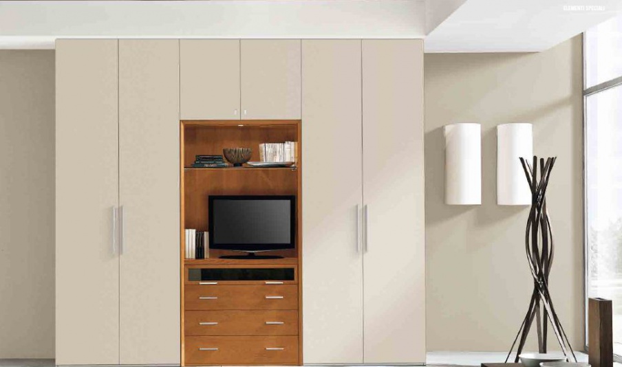 Modular system for TV Anta Liscia Tecnica from the Italian manufacturer Serenissima. Made from solid wood, surface: varnish, matte finish. The Central niche for the TV in the finish from the cherries. Accessories metal. Colors from the range, perhaps a combination of white facades and natural wood. The product in modern style. Combines functionality and beauty. A perfect choice for modern interior design living room, study.