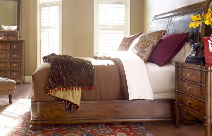 Double bed Acquisitions from the American manufacturer Henredon. Model with a frame made of Philippine mahogany with a coating of veneer American walnut. Headboard upholstered in leather. Bed classic style with a modern edge. The product will fill the bedroom with sophistication and elegance.