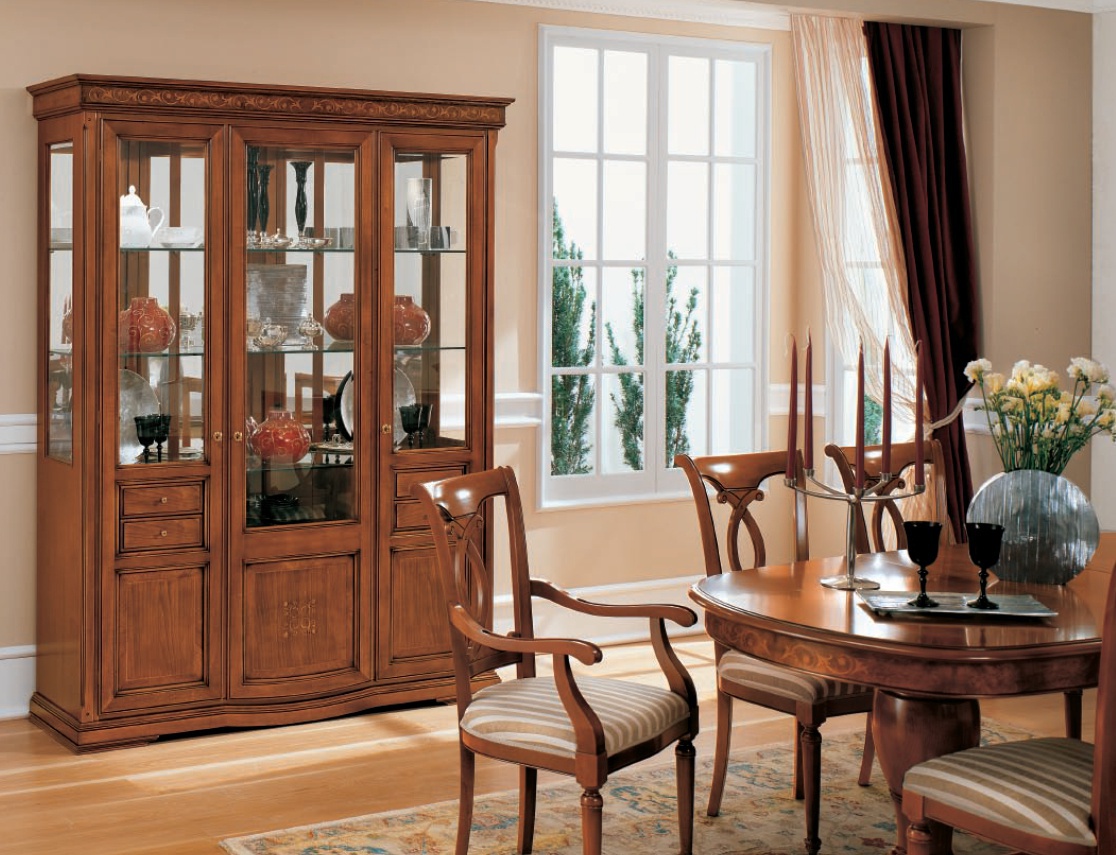 Dining room (dining set) Medici from the Italian manufacturer Tempor, includes dining table, chairs, display cases, buffet. The facades are decorated with elegant furniture with inlaid veneer. Large range of sizes will allow to group typefaces according to Your desire.