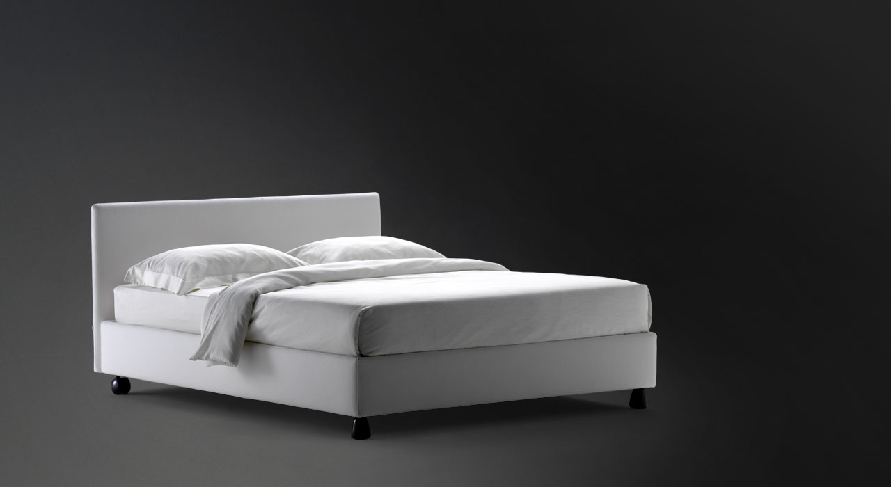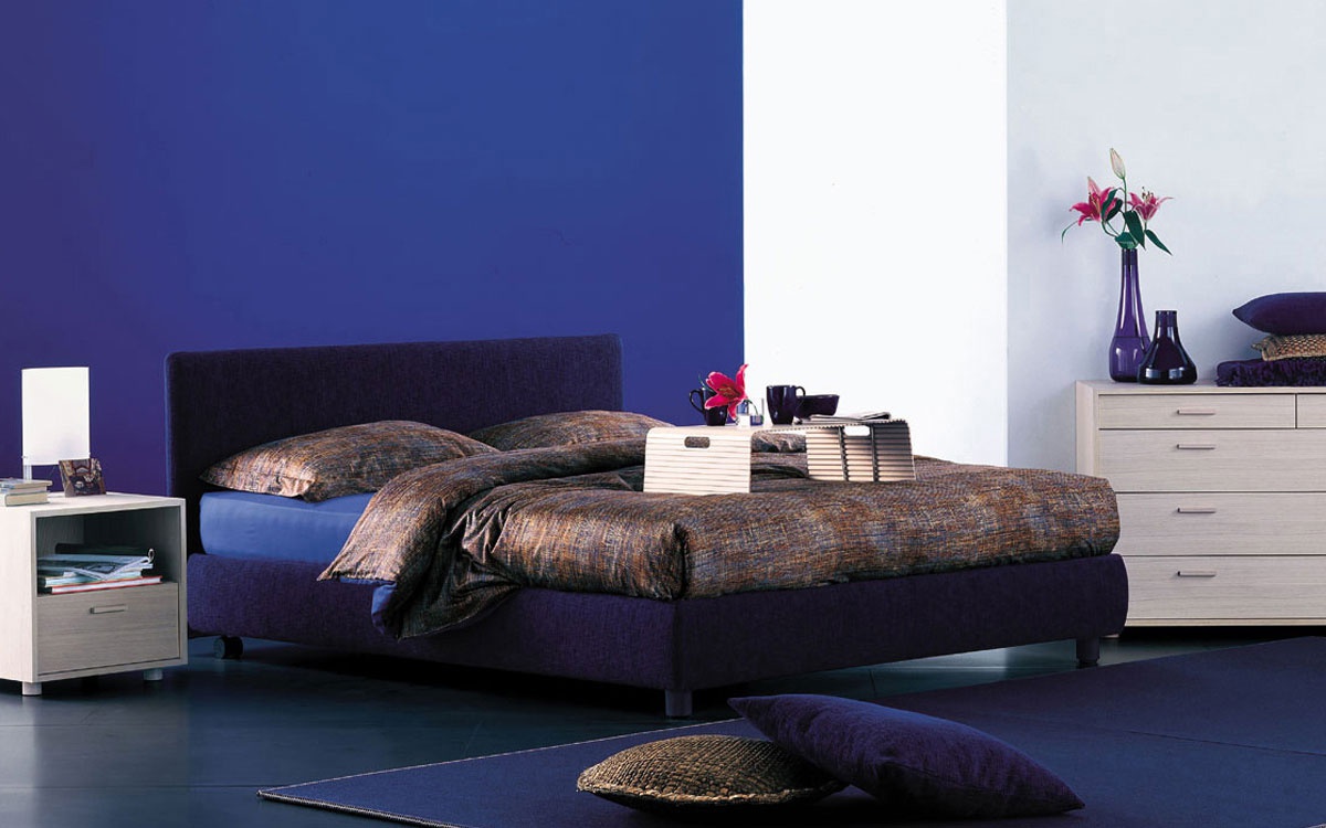 Bed Notturno from the Italian manufacturer Flou. The frame is made from aluminium, the head - steel, upholstery - leather or textiles from a range of campaigns. Optional storage compartment. Model with high headboard for the bedroom is designed in modern style. Product color blue.
