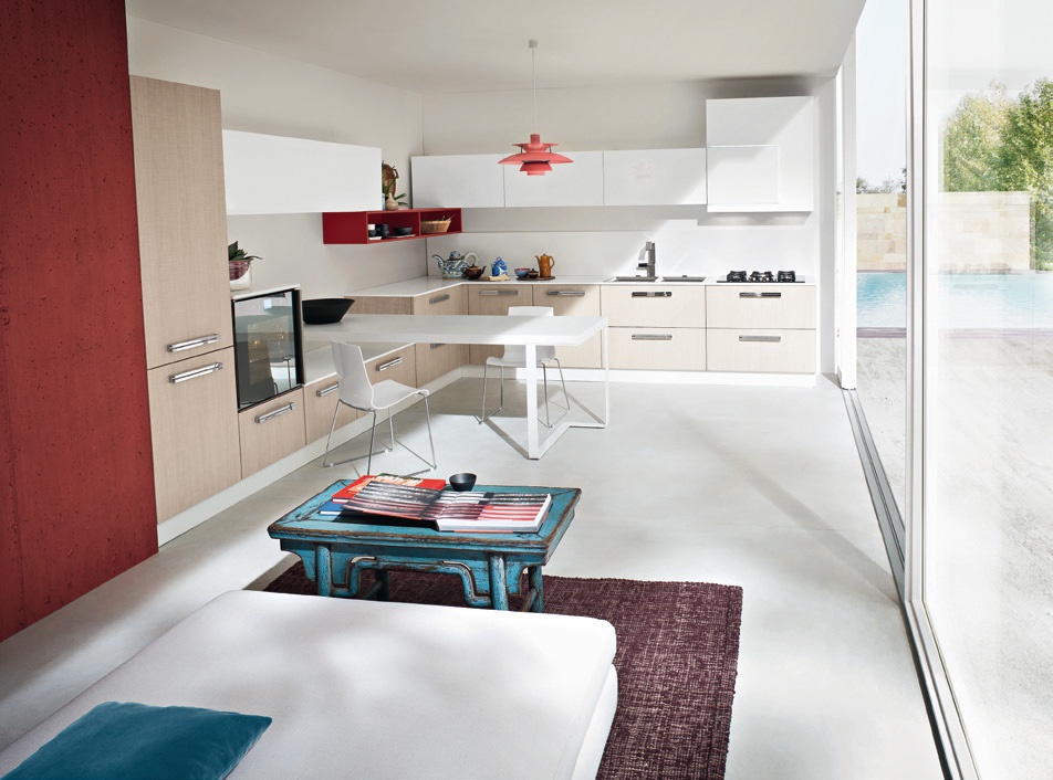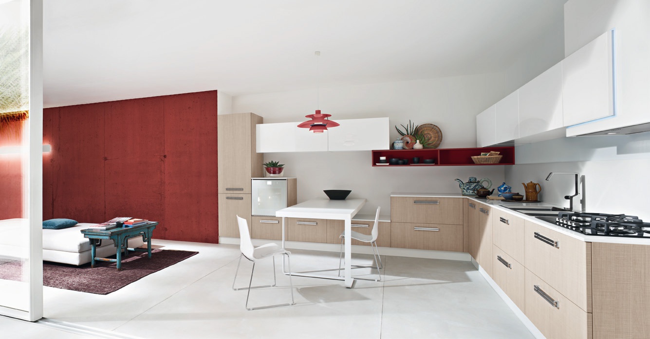 Kitchen Tao comp.1 from the Italian manufacturer Ar-Tre. The headset frame is made of waterproof wood. Facades made of solid wood, with sawn structure and MDF in white glossy lacquer, handles metal. The counter tops of different heights made of artificial stone. Built-in appliances. Colors to choose from manufacturer's catalogue. Kitchen designed in modern style. Provided dining table rectangular shape.