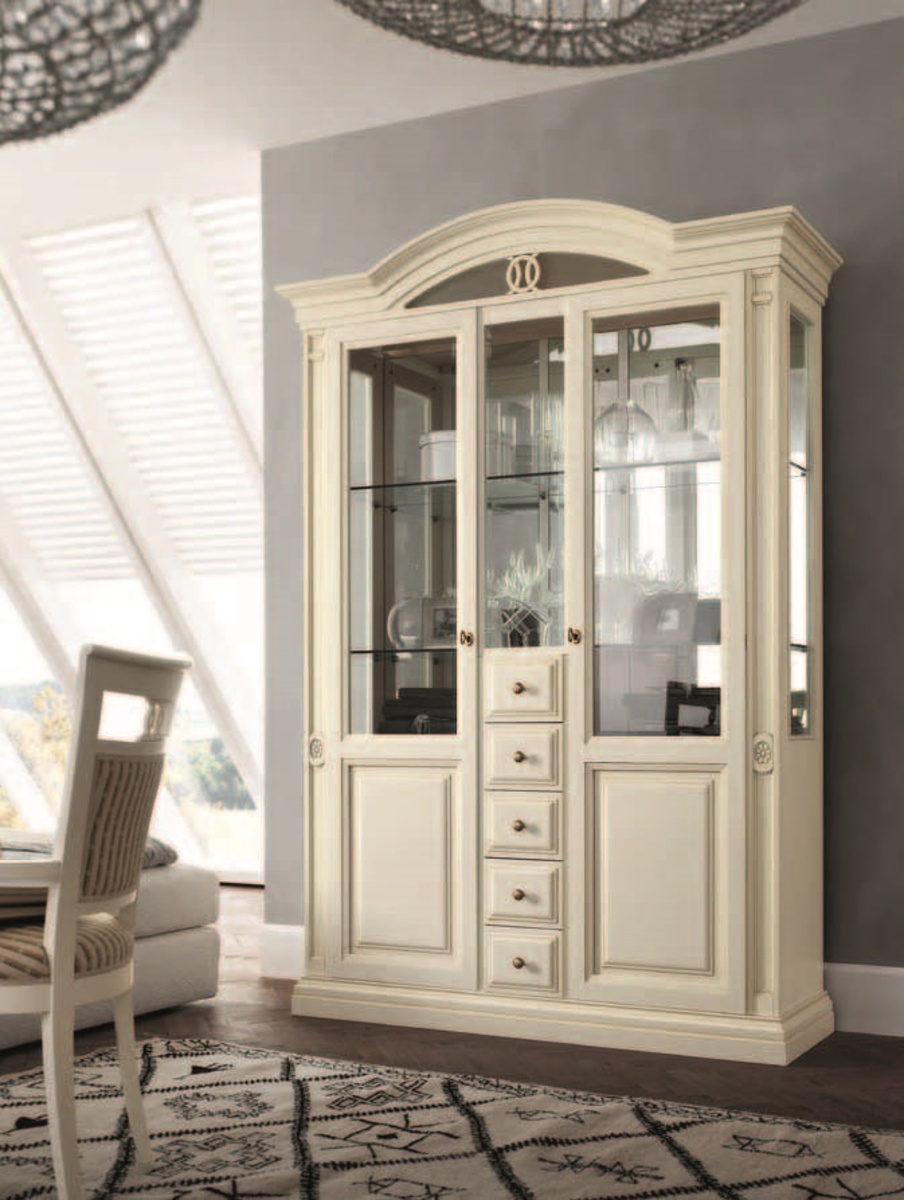 Showcase Nabucco from the Italian manufacturer Maronese. Model in the classic style, the frame is made of wood. Showcase has five drawers, two doors, two glass shelves and two wooden shelves. Interior lights and mirror back wall display gives special originality. Showcase Nabucco will perfectly decorate Your interior.