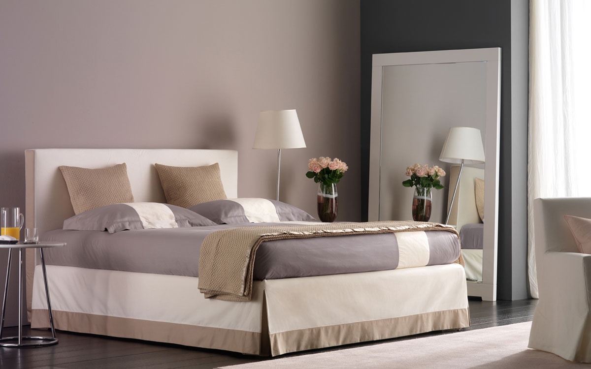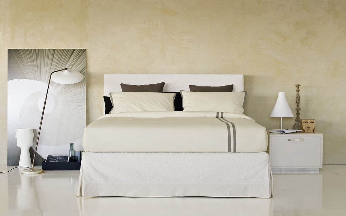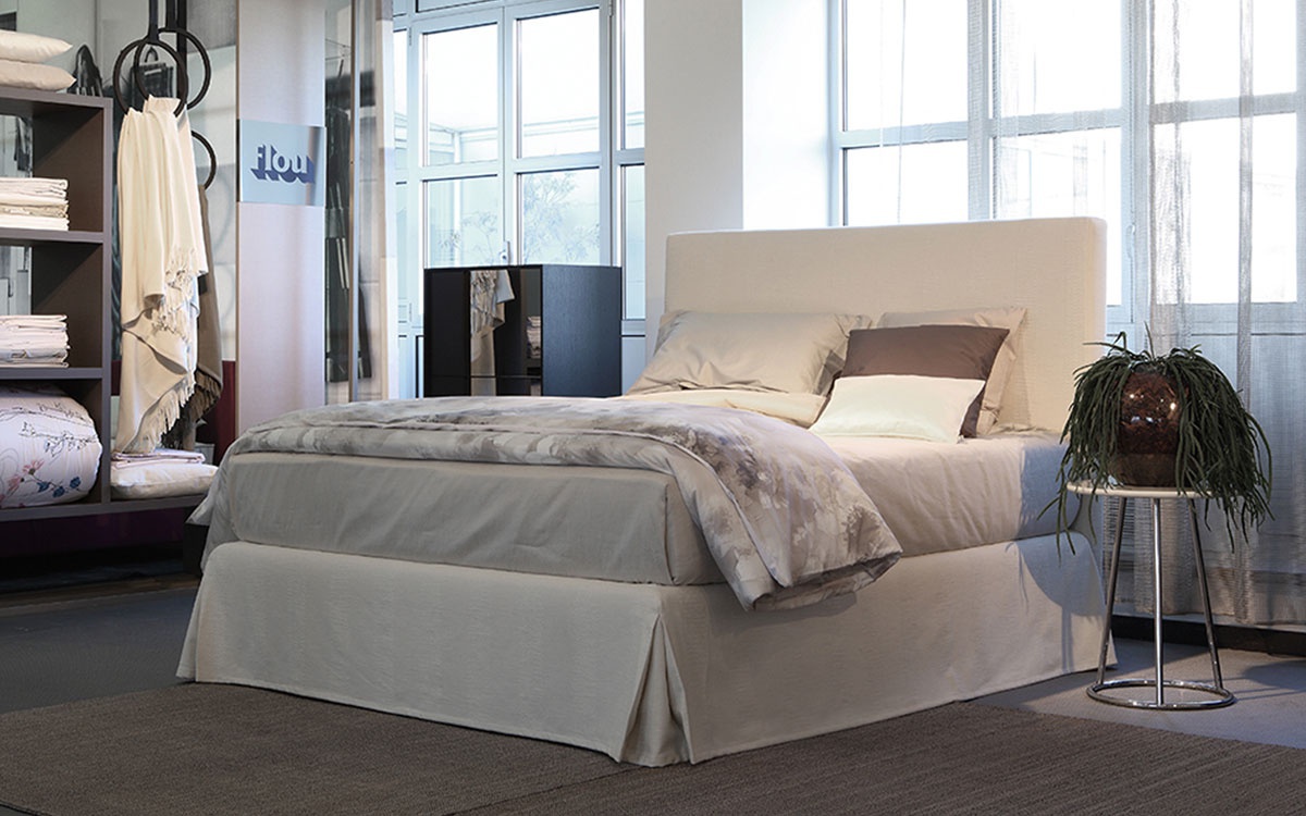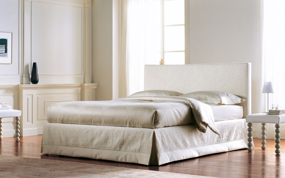 The Plaza bed from Italian manufacturer Flou. Upholstery - textiles from a range of campaigns. A model with a high headboard and a storage compartment. A perfect model for bedroom in a modern style. Product color white.
