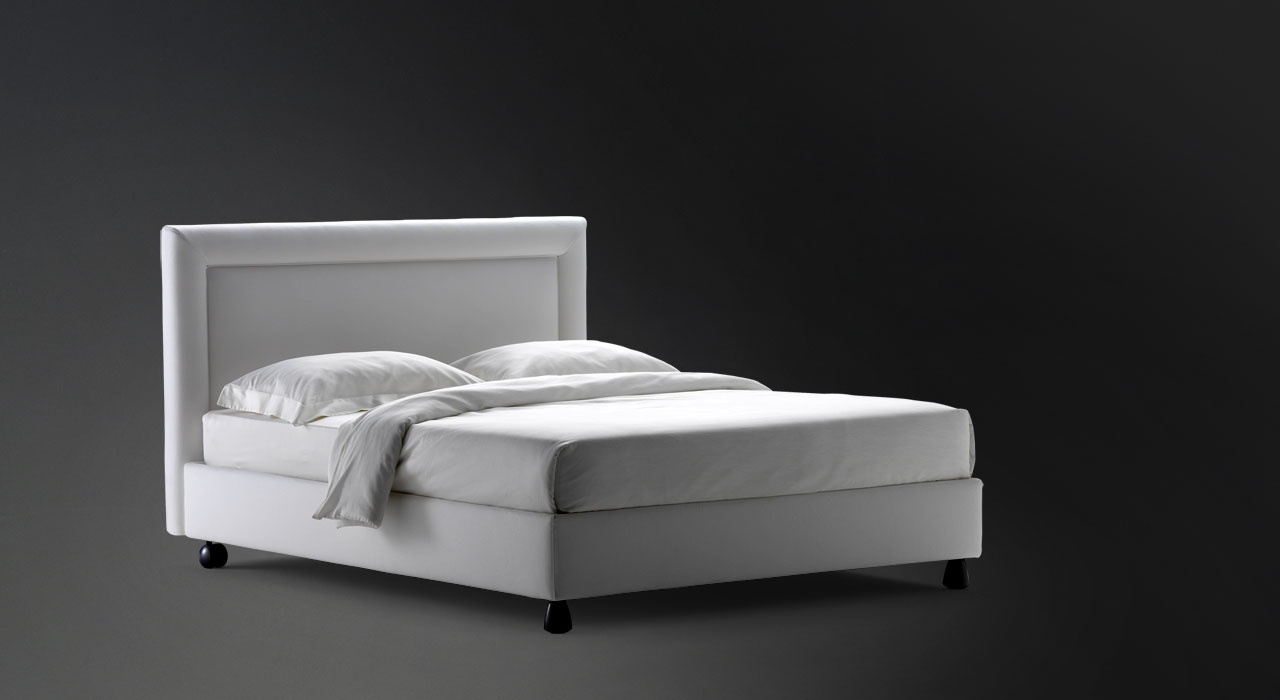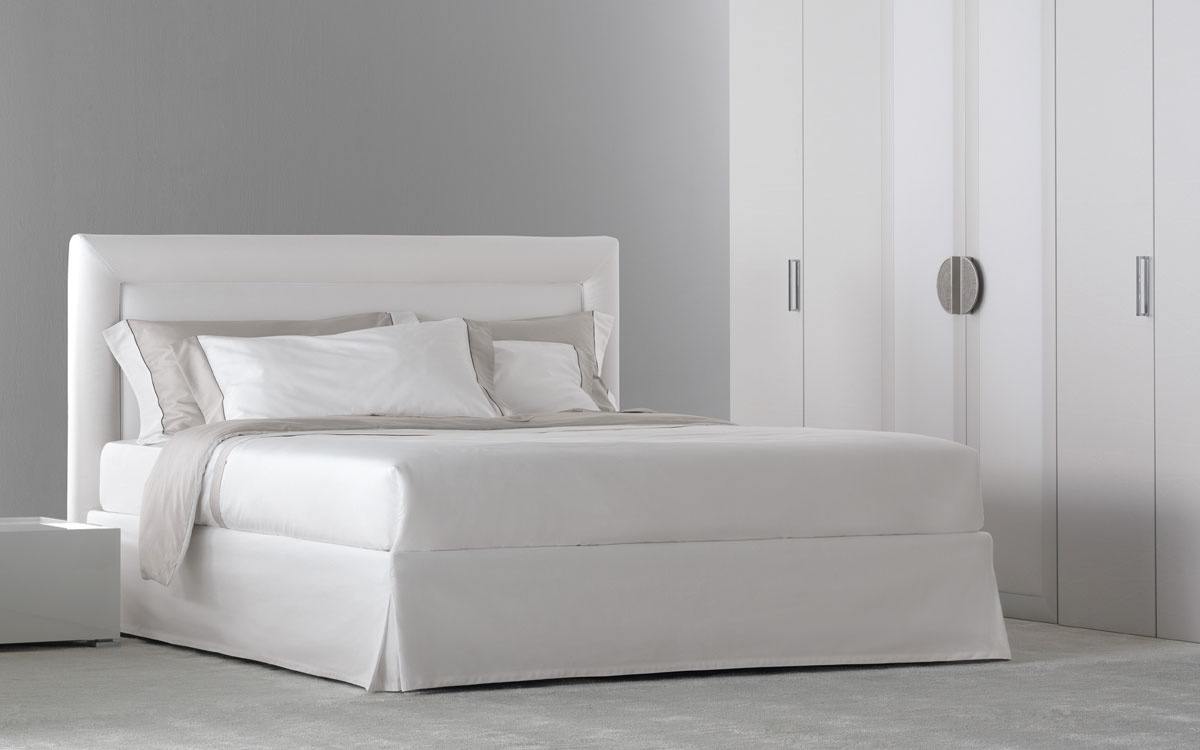 Bed Pochette from the Italian manufacturer Flou. Upholstery - leather or textiles from a range of campaigns. Double model with built-in storage capacity. Bed with upholstered high headboard for the bedroom is designed in modern style. Product color white.