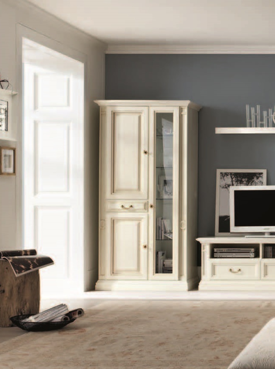 A display Cabinet, Nabucco from the Italian manufacturer Maronese. Model in the classic style, the frame is made of wood. A display Cabinet has two wooden and one glass door, one drawer, four glass and two wooden shelves. Also has interior lights. Comfortable and feature a display Cabinet will be a luxurious decoration of Your interior.
